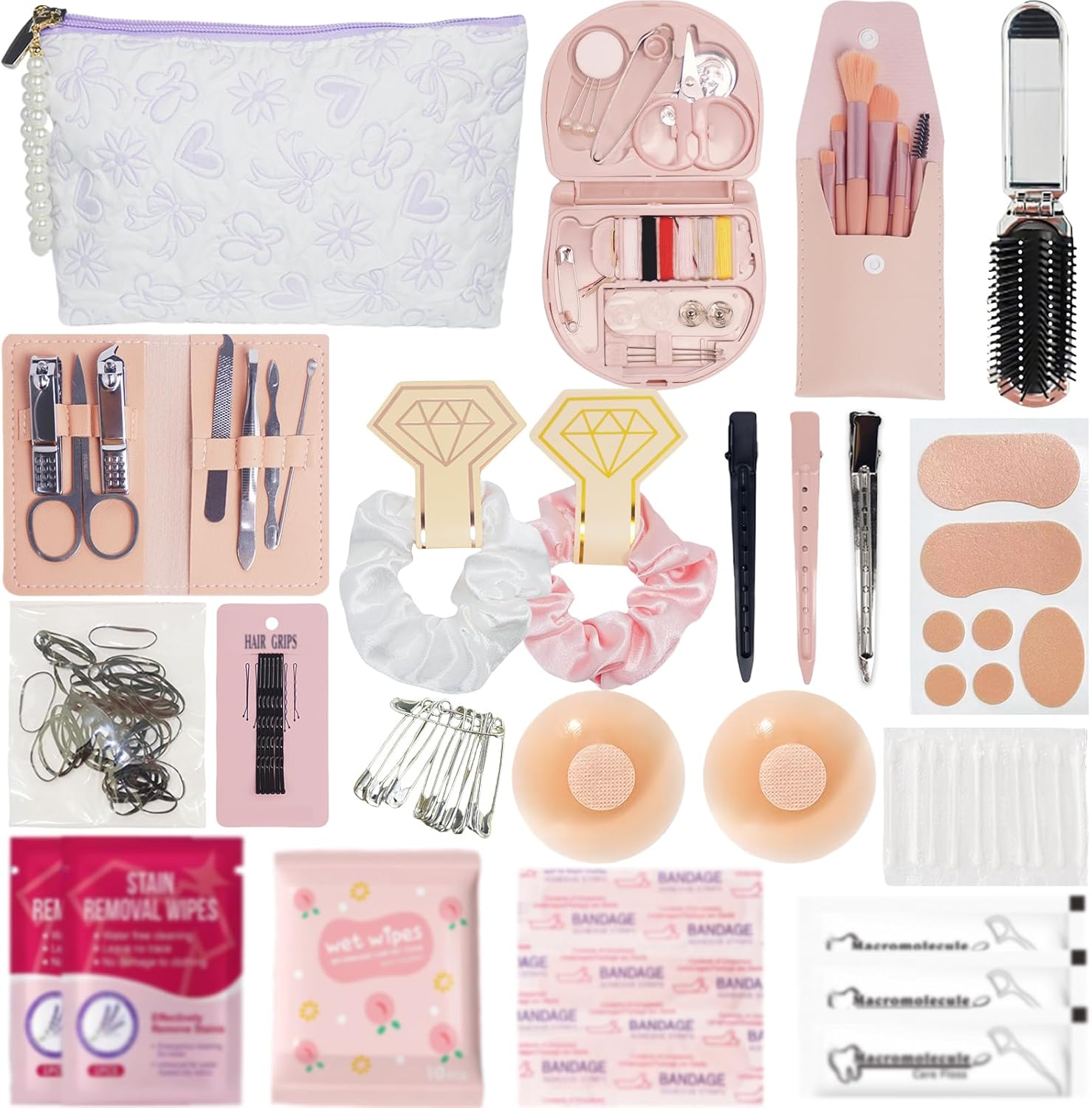 Beauty and personal care: This bride emergency kit contains a set of makeup brushes, which is perfect for touch-ups anytime, anywhere. The manicure kit includes manicure tools, nail files, toenail clippers and ear spoons; in addition, there is a pack of wet wipes, nipple covers, bandages, dental floss, cotton swabs, stain removal wipes and other personal care products to meet all your personal care needs on the wedding day; for women, this is indeed a complete emergency kit for their special day