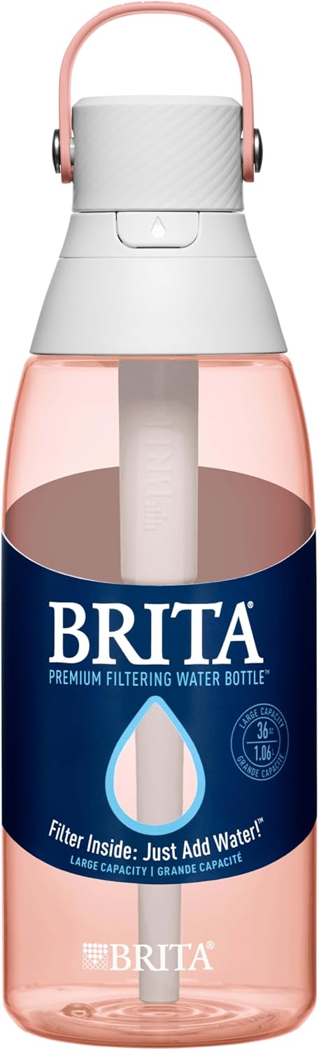 BRITA WATER FILTER BOTTLE: One 36 oz. BPA-free Brita Hard-Sided Plastic Premium Filtering Water Bottle with one filter that reduces chlorine taste and odor in water as you drink