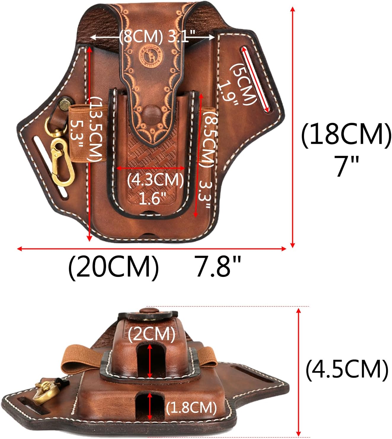 The internal dimensions of the leather phone holder for belt are 5.1”(H) × 2.9″(L) × 0.75″(W) inches, it is compatible with all mobile phone models up to 6.7 inches.