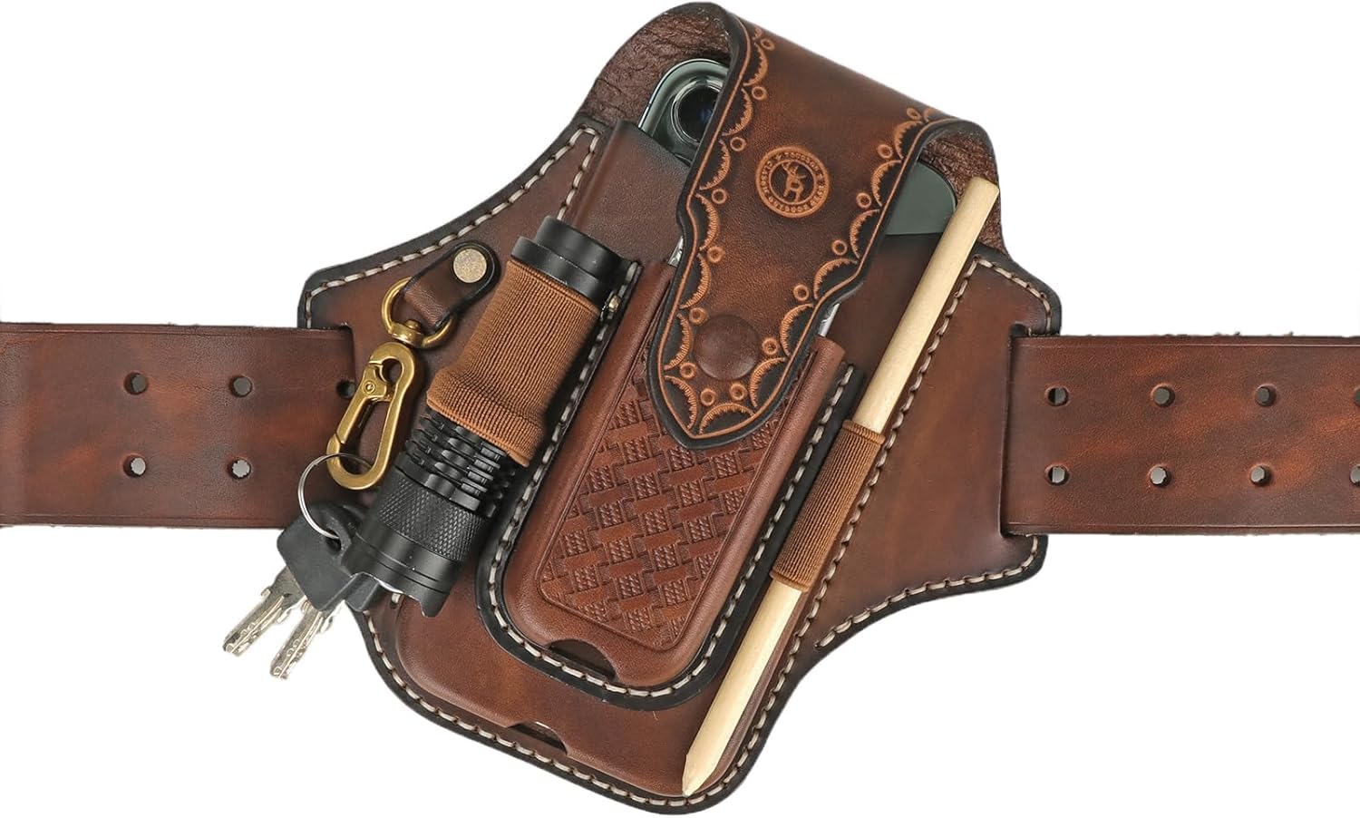 An all in one EDC leather pouch for men on belt, with a large phone pouch, a specific multitool sheath, also a flashlight sheath,one tactical pen holder and one keychain.