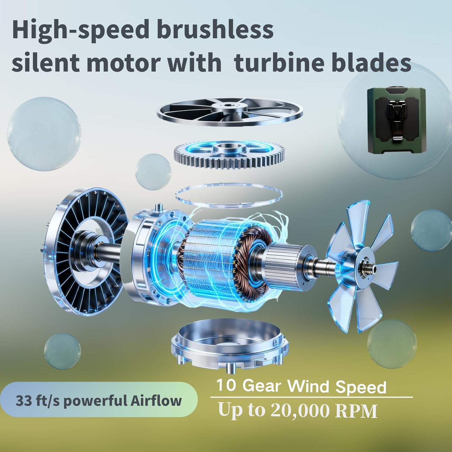 π 20000RPM Turbo Wind & 10-Speed Customization Experience unmatched cooling power with a 20000RPM ultra-high speed motor that delivers a powerful, deep-reaching breeze. With 10 precise speed levels, you can customize your comfort from a gentle whisper to a turbo-powered windstorm, perfectly suited for any activity or temperature.