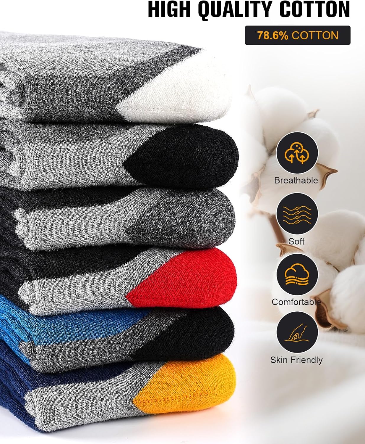 These thick cushioned running socks size 10-13 feature colorful calf socks styles and are made from moisture-wicking cotton for breathable and comfortable wear. Sturdy and durable, they provide arch support and are non-slip, anti-odor, and perfect as work socks. Ideal as sports socks, boot socks, hiking socks, calcetines para hombre, medias hombre, calcetas para hombre, walking socks, stocking stuffers for men. Comfortable in summer, warm in winter. Pack of 6 pairs