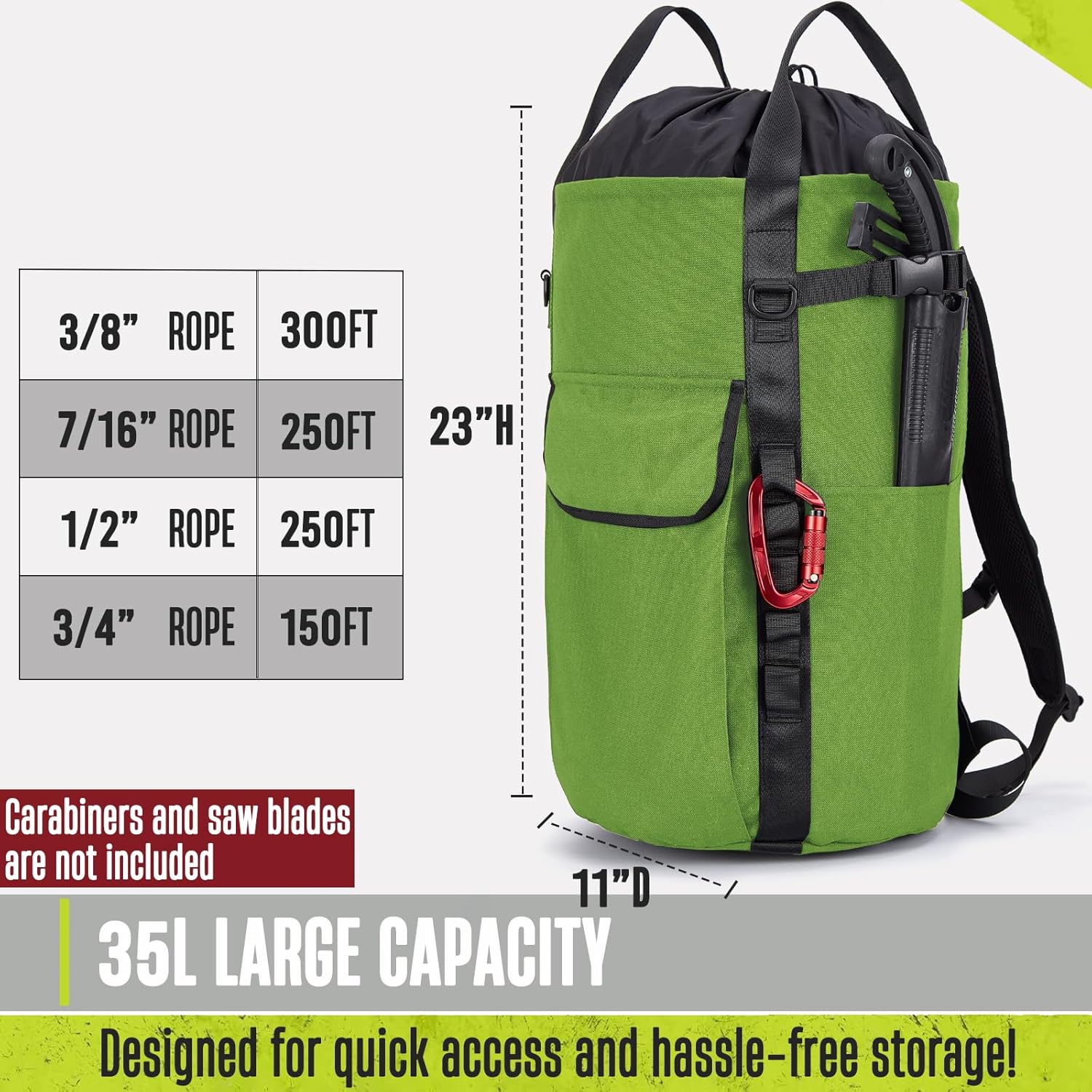 Quick & Easy Access: With dimensions of 23″ (H) x 11″ (D) and a 35L capacity, this tree climbing rope bag fits long ropes like 250 feet of 1/2″ rope, 150 feet of 3/4″ rope, 250 feet of 7/16″ rope, or 300 feet of 3/8″ rope; The quickdraw closure secures your gear in seconds with a simple pull of the drawstring; A double-reinforced bottom ensures your gear stays safe during transport across job sites