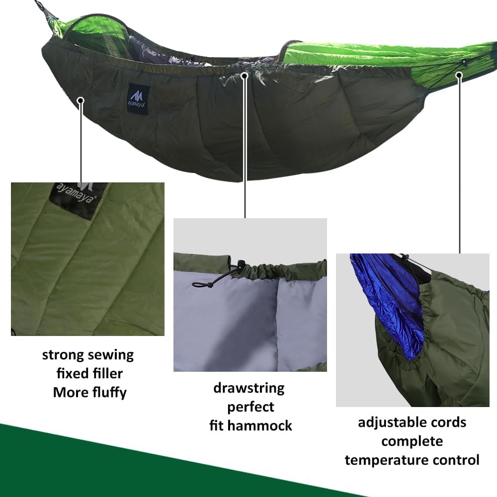 DURABLE MATERIAL – Our hammock underquilt is made with strong, 20D ripstop nylon, DWR water-resistant coating, and reinforced stitching. The wind-proof under quilt can withstand all weather conditions.