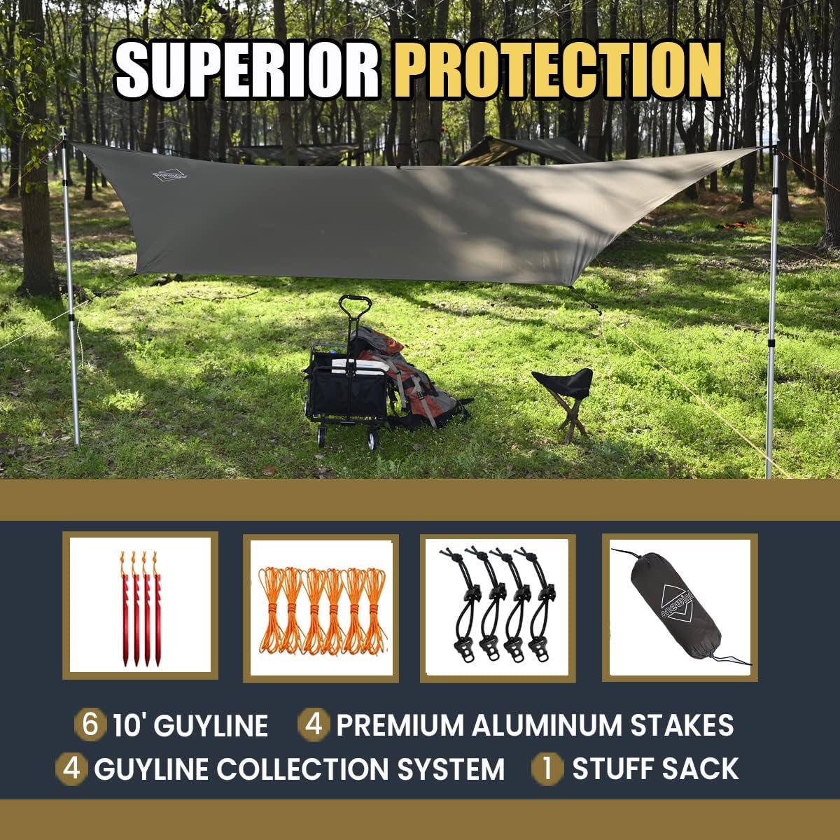 SUPERIOR PROTECTION. Measuring 12×10 ft, our Hammock Tarp offers wide coverage and delivers excellent shielding from the elements – rain, sun, and wind. It’s made from 1.1oz 20D ultralight ripstop silnylon which is strong, durable, waterproof, windproof snowproof, and much lighter than 210T fabric. It also features PU 4000mm coating on inner face and silicone coating on outer face to make the rain slide down faster.