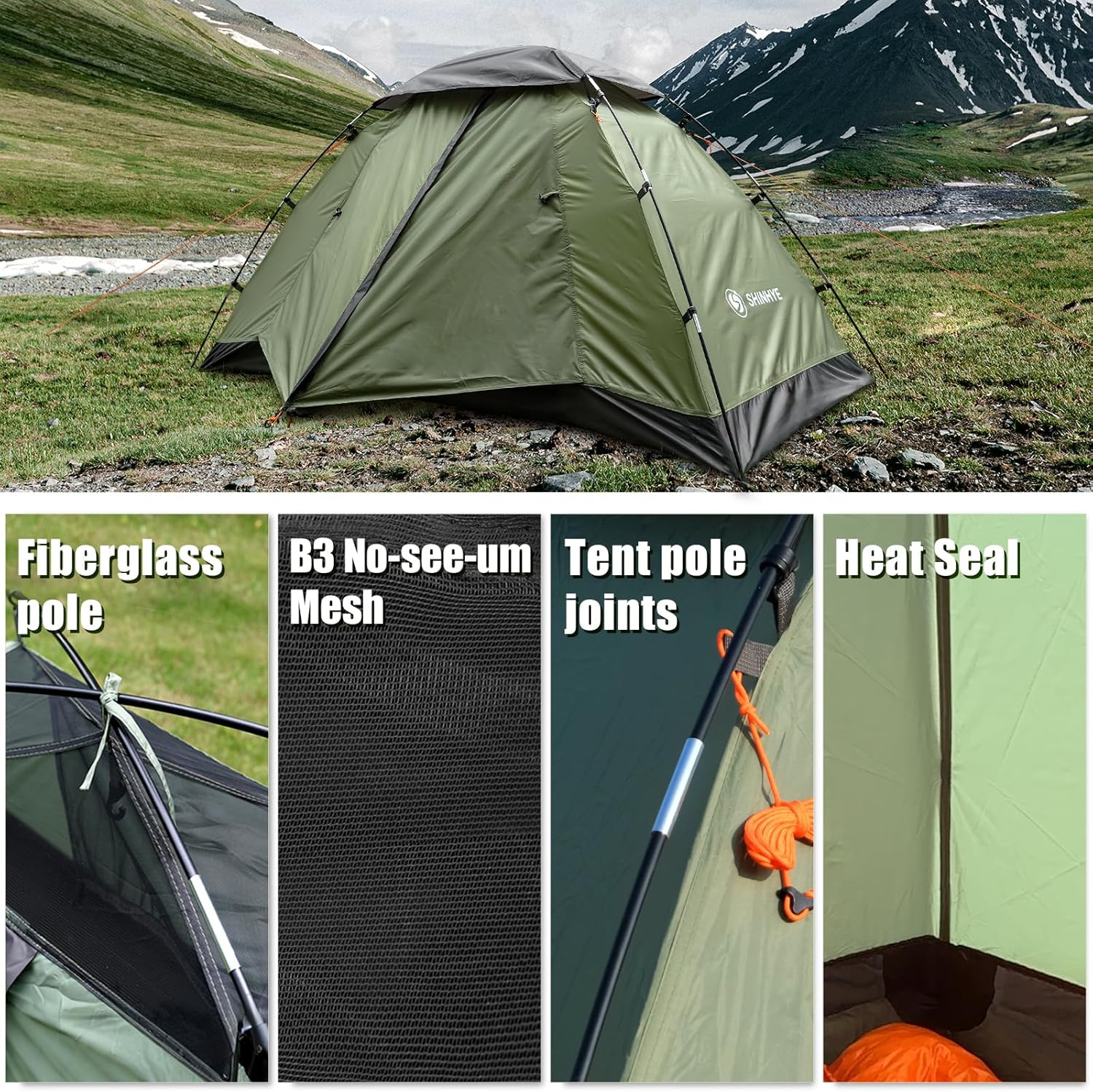 【2 Person & 3 Season Tent】– The tent space is sufficient for adults to use and there is enough space to store backpacks. Before entering the single tent, there is enough space for one people to store shoes. Please note: 1-person tent has 1 door, 2-person tent has 2 doors