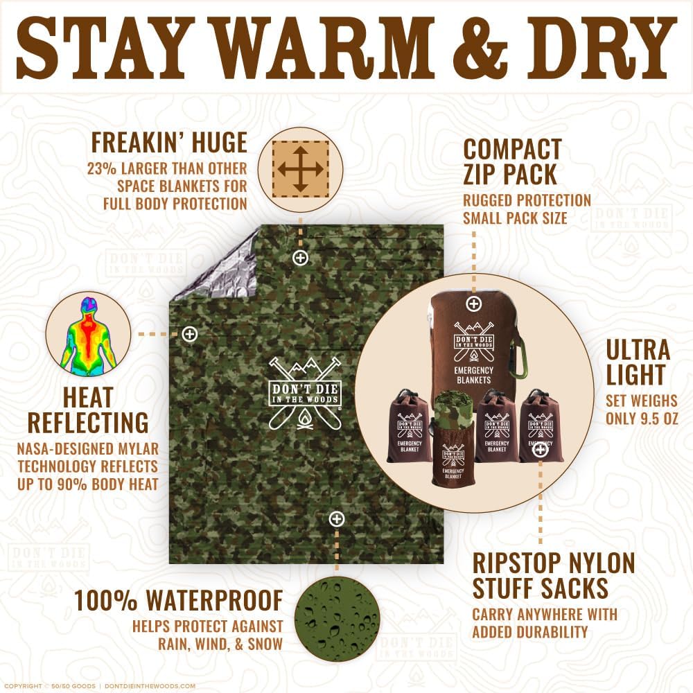 ![Don’t Die In The Woods – Freakin’ Huge Emergency Blankets [4-Pack] Extra Large Thermal Mylar Space Blanket – One of The Ten Essentials Outdoor Survival Gear for Hiking Camping First Aid Kit (Camo) Don’t Die In The Woods – Freakin’ Huge Emergency Blankets [4-Pack] Extra Large Thermal Mylar Space Blanket – One of The Ten Essentials Outdoor Survival Gear for Hiking Camping First Aid Kit (Camo)](https://m.media-amazon.com/images/I/81Z1BSzm1wL._AC_SL1100_.jpg)
