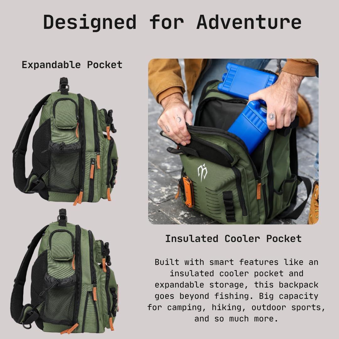 EXPANDABLE POCKET – The fishing backpack with tackle boxes has a built-in zipper compartment that allows you to expand the backpack, creating even more space for you if you need.
