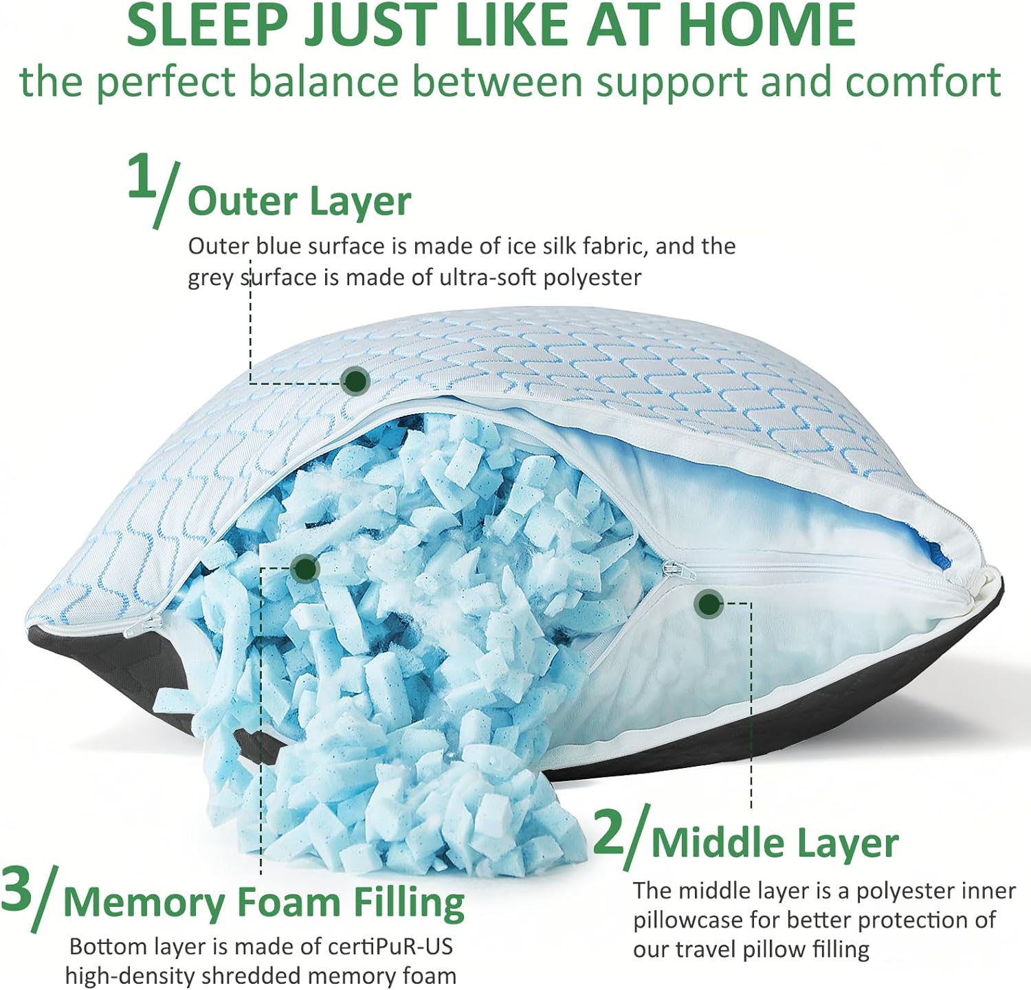 PREMIUM SHREDDED MEMORY FOAM FILLING: The memory foam pillow is height adjustable to perfectly fit the contours of your head and neck, giving you a truly supportive rest, compared to inflatable pillows, memory foam pillows fit the body’s curves better for a better sleeping experience on the go!