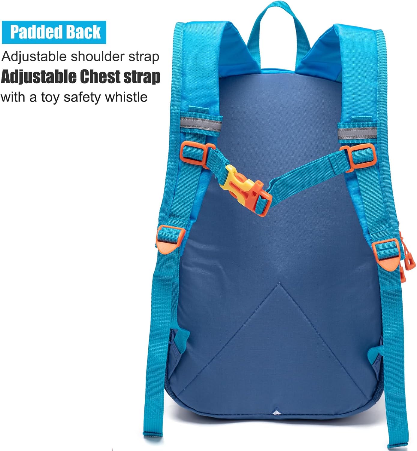 Safety features: a toy whistle on the chest strap, a reflective strip in the front, and 2 small reflective strips on the shoulder straps