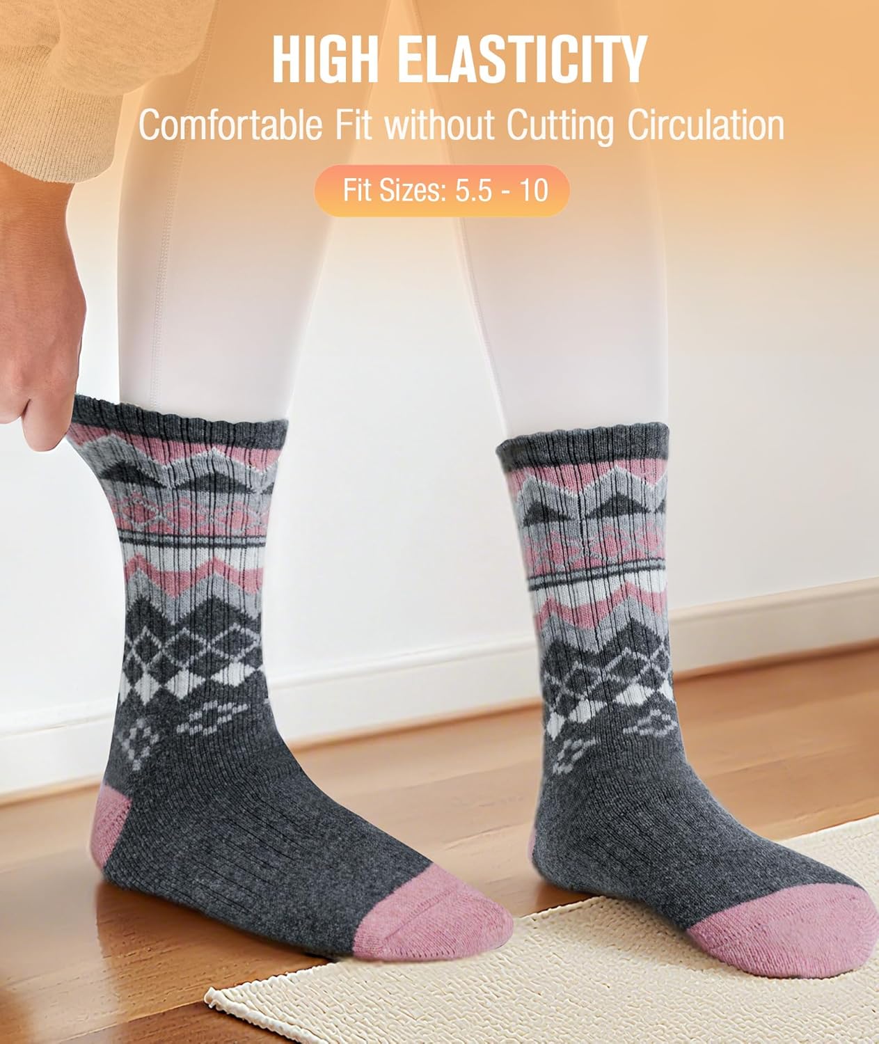 Customers find these wool socks perfect for cold days outside and appreciate their comfort, with one noting they’re thick enough to keep feet warm in cold weather. They receive positive feedback for their softness, with one customer highlighting their cushioning for hiking boots, and customers describe them as well-made with cute colors. The socks are nice and thick, and customers say they are holding up well. Customers disagree on the fit, with some finding them perfect while others say they run very loose.