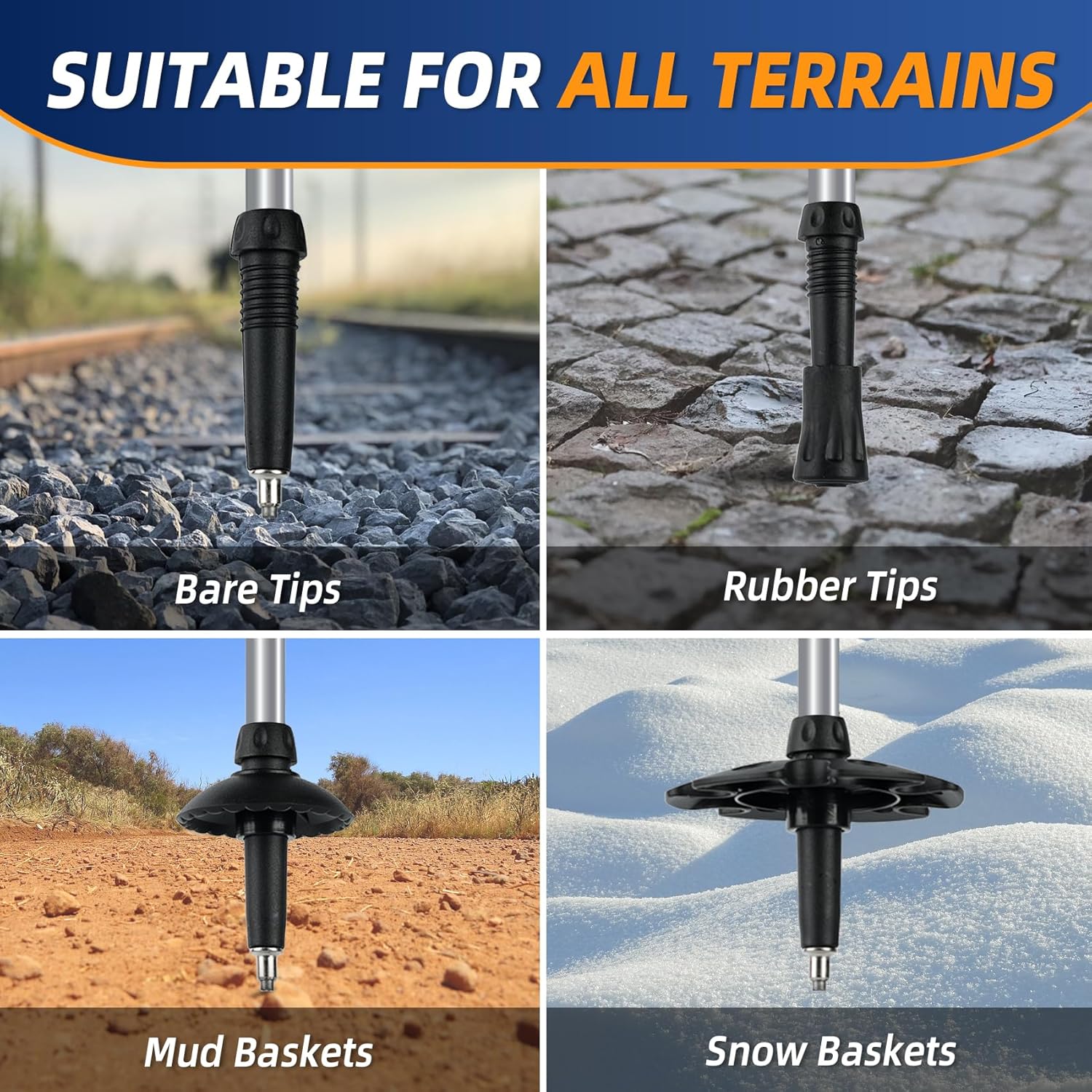 PERFECT SERVICE: Each purchase includes 2 rubber tips, 2 snow baskets and 2 mud baskets to ensure seamless adaptation to snow, mud, uneven terrain and more. Lightweight and sturdy, these replacement tips will keep your hiking poles ready for any trail condition, so you never have to stop your trek. All products are covered by a one-year warranty against defects in materials and workmanship