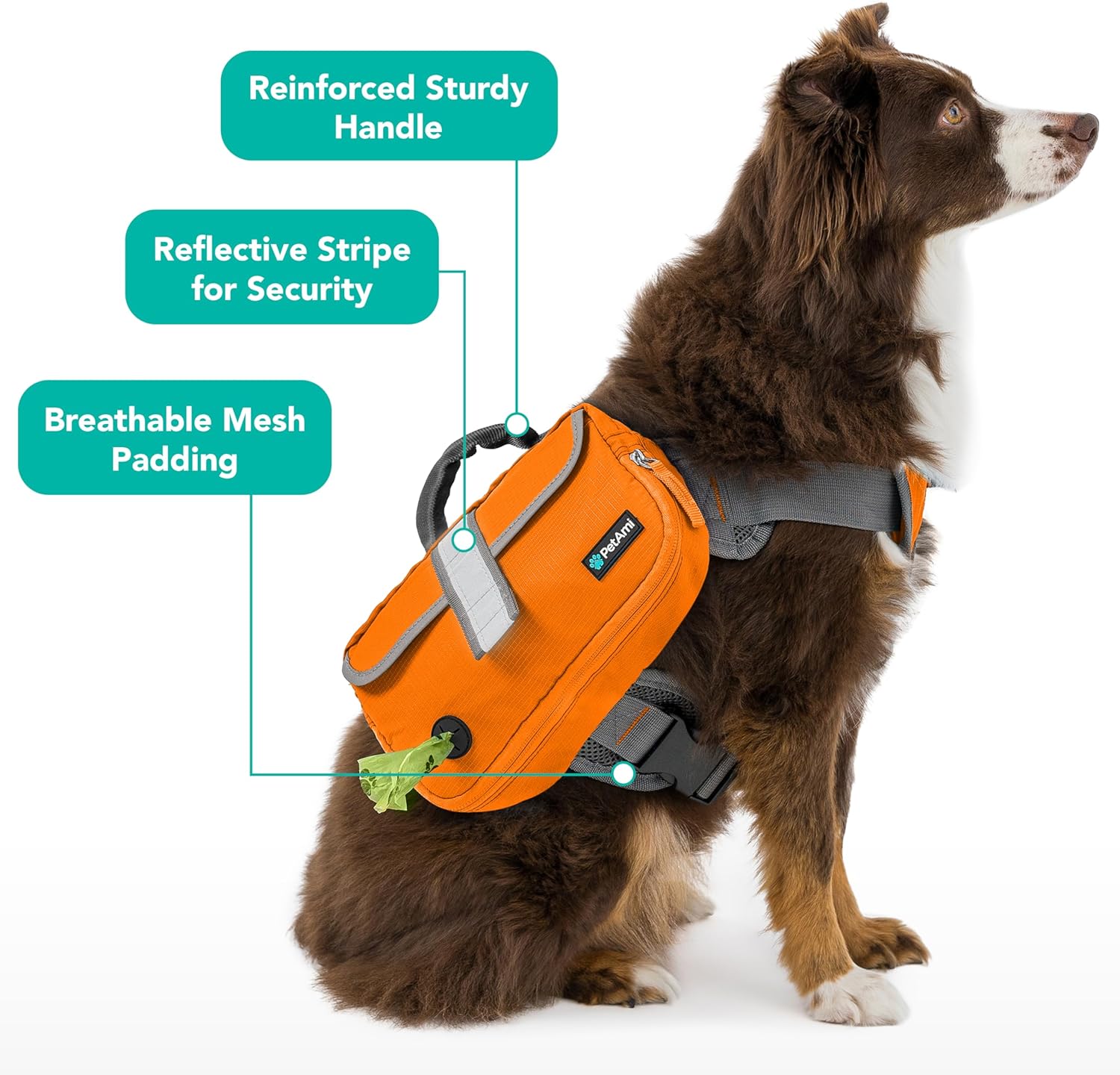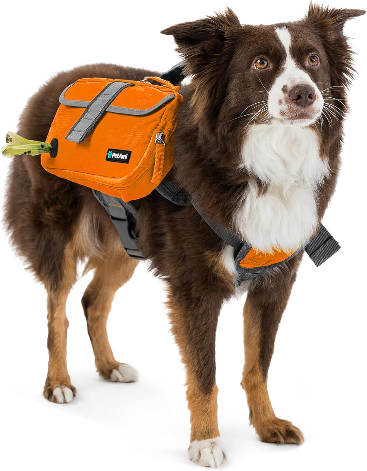 DOG SADDLE BAG: This dog backpack harness for dogs to wear is designed with utility in mind for both the owner and your best friend. Multiple compartments with adjustable fit ensurse this dog vest with pockets fits snuggly on your dog while holding all essentials such as treats, doggie bag, toys, first aid supplies and travel bowls. Ideal for medium to large size dogs. Comes with a built in poop bag dispenser for picking up doggie waste!
