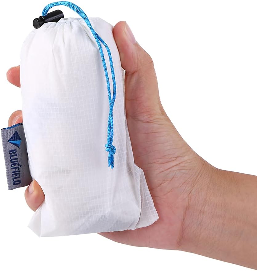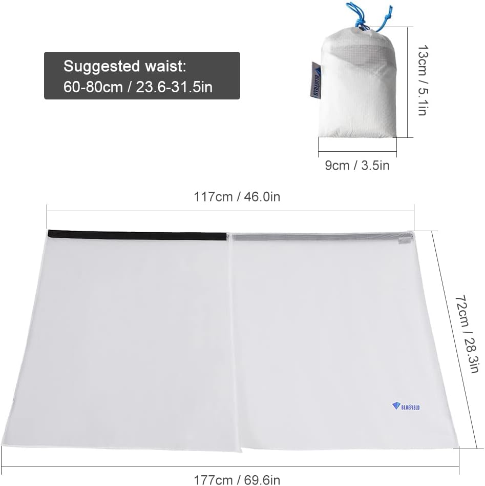 Material: 15D NylonColor: Blue / White (optional)Suggested waist: 60-100cm / 23.6-39.3inWeight: 60g / 2.1ozPackage weight: 70g / 2.4ozPackage size: 13 * 9 cm / 5.1 * 3.5inPackage list : 1 * Rain Skirt, 1 * Storage Pouch