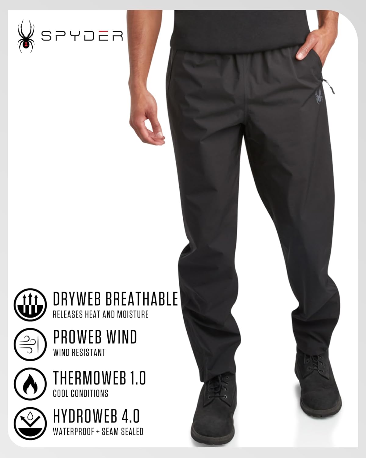 Spyder Mens Rain Pants are built for adventure, rain or shine. These waterproof, seam-sealed pants offer full coverage against wind and moisture while staying lightweight and breathable enough for layering. Whether you’re wearing hiking pants men trust in the woods, fishing pants for men by the shore, or work pants for men commuting in unpredictable weather, these mens hiking pants deliver tactical-type function and athletic comfort. The elastic waistband with adjustable drawcord ensures a secure, personalized fit. Half-leg zippers with Velcro ankle closures make it easy to pull these pants on or off over boots. Thoughtful details like smooth-operating zippered hand pockets protect your essentials and complete the sleek, minimalist silhouette. These aren’t bulky overpants — they’re your go-to rain pants for men who demand performance without compromise. Looking for fathers day gifts that are actually useful? These waterproof hiking pants are perfect for the dad who loves the outdoors. Whether you’re shopping for fathers day gifts for dad who hikes, or a practical fathers day gift for husband who fishes and travels, these pants deliver the versatility he needs. Instead of another fathers day card, give him gear he’ll actually use — pants that perform on the trail, the boat, or the job site. They also make excellent dad gifts year-round, whether for birthdays, holidays, or special adventures. A great fathers day shirt alternative, these packable pants are built to keep up with whatever Dad tackles next.