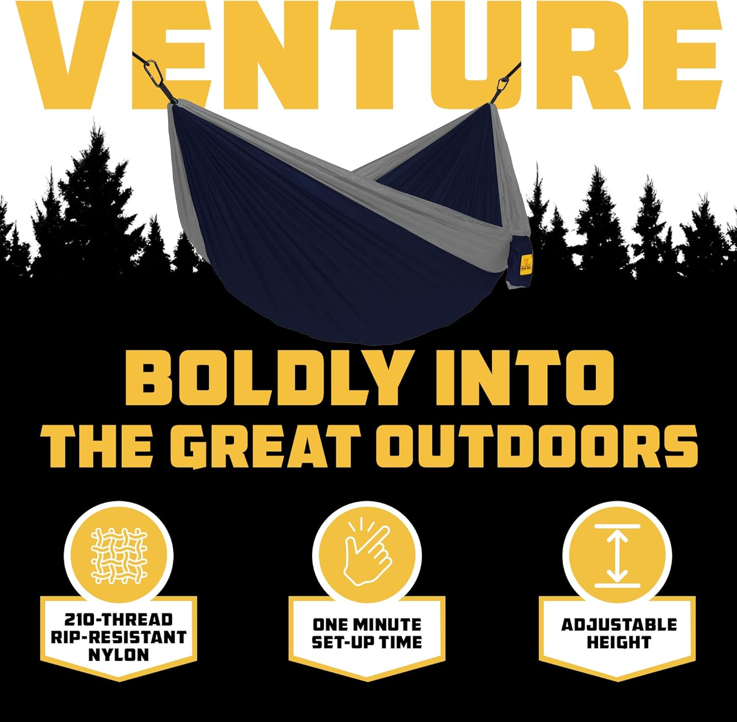 Customers find this hammock to be of good quality, comfortable, and easy to set up, with one mentioning the included straps make setup particularly convenient. The hammock is praised for its durability, with customers noting it hasn’t ripped during use, and its lightweight design makes it ideal for backpack hiking. They appreciate its perfect size for two people and the included tree straps and carabiners, considering it well worth the price.