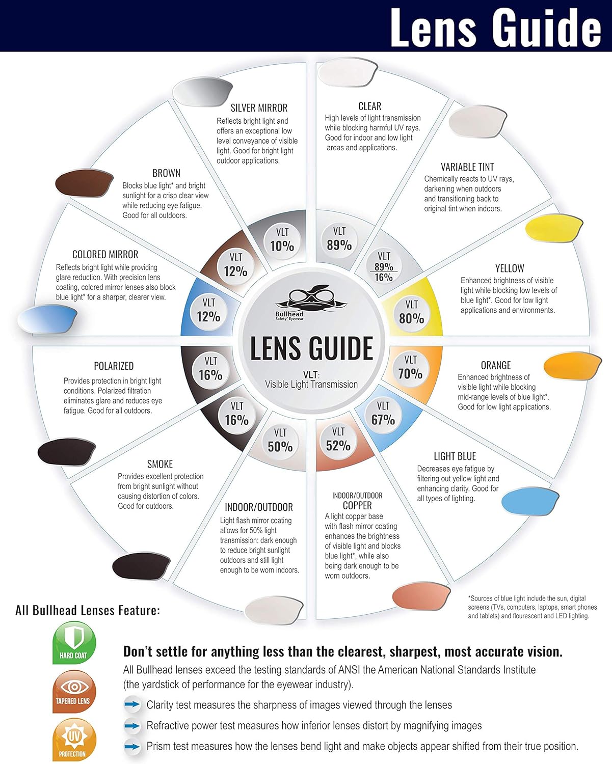 Precision Lens – Bullhead Safety precision lenses manage how much blue light reaches the eye, ensuring objects appear sharper and clearer while reducing eyestrain and fatigue. They also filter out 99.9% of dangerous UV light.