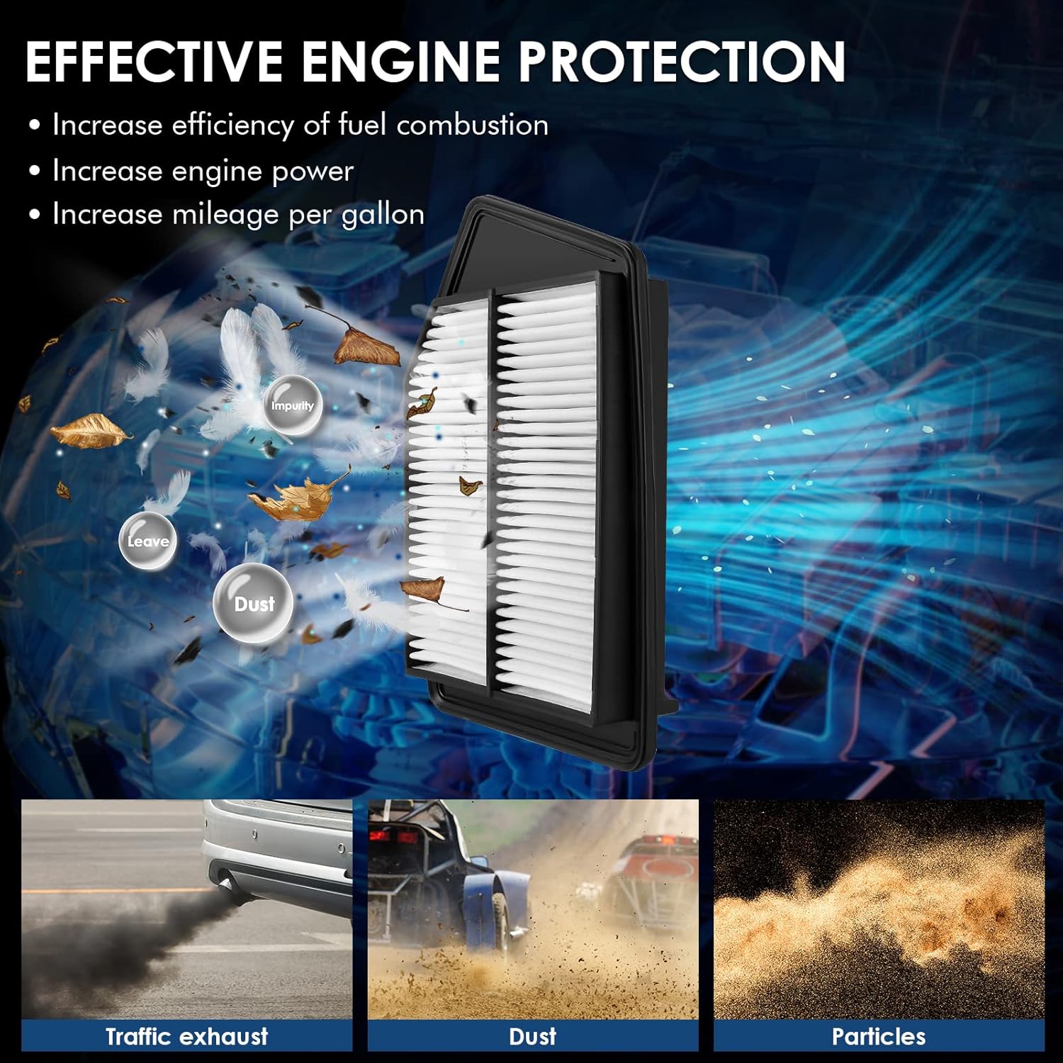 Engine air filter made of high-density, high-capture ability and high-breathable fabric material. Reliably filters out 99% of impurities in air and provides larger volume clean airflow for engine.Increases efficiency of fuel combustion, mileage per gallon and optimizes engine power.Compatible match for the OEM engine air filter with same exact size.Easy installation withour any tools or modification, only 3 steps replacement in 5 minutes. Uses a leak-proof frame design to improve sealing performance and reduce vibration noise.High-stength filter material maintains stable filtration performance.Maximized filter material folding layers and area offers 30% more dust capture capacity.
