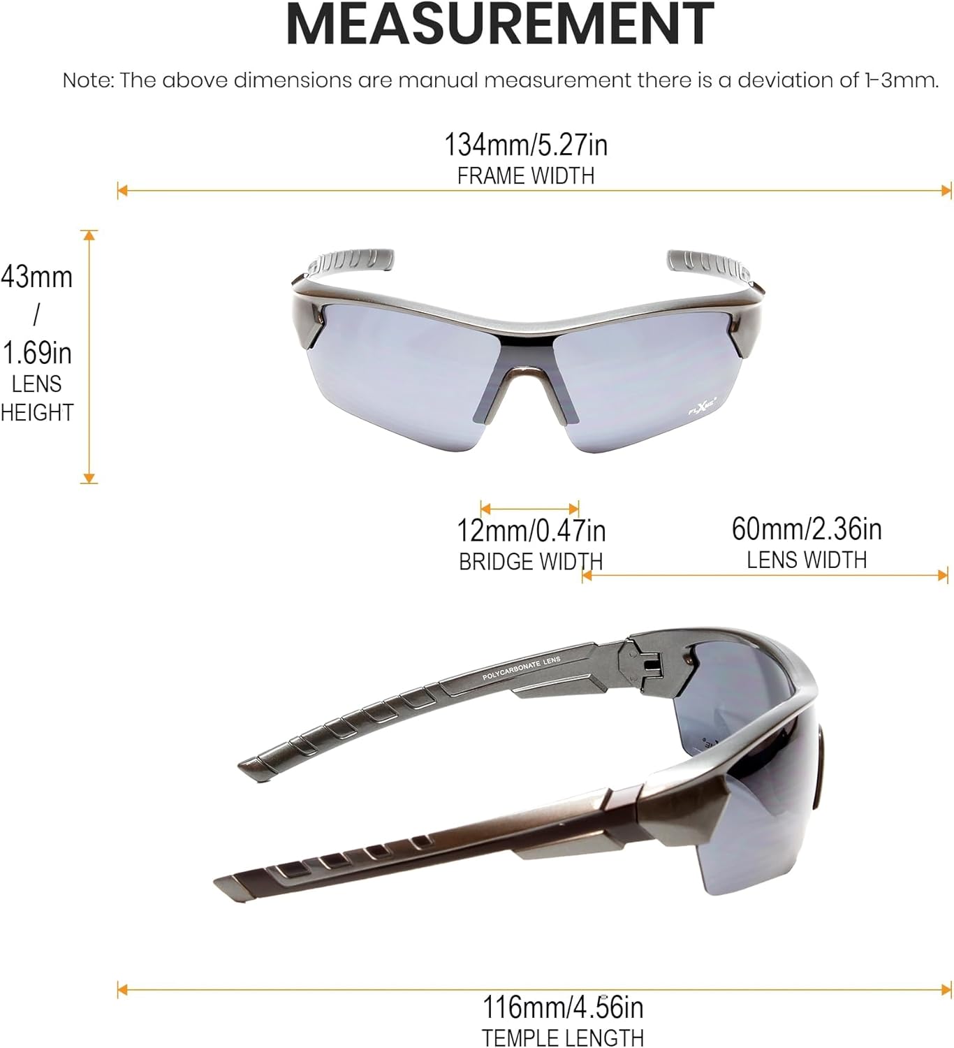 The Calabria Overhead Slam Pickleball Sunglasses offer detailed specifications to ensure an ideal fit. With a Lens Width of 60mm (2.36 inches), Lens Height of 43mm (1.69 inches), Temple Length of 116mm (4.57 inches), Frame Width of 134mm (5.28 inches), and Bridge Width of 12mm (0.47 inches), these golf glasses are designed for unisex wear. Enjoy reliable pickleball protective eyewear that enhances your sporting experience with these precisely crafted sunglasses.