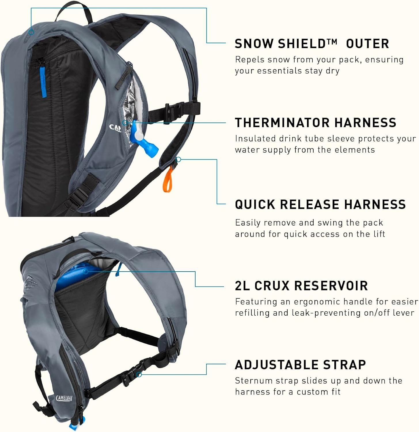 SnowShield Fabric: Repels snow and moisture to keep gear dry and protected