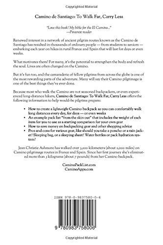 “Love this book! My Bible for the El Camino…”The classic book used by thousands to learn what you should take on a Camino journey. Includes:Pros & Cons for difficult gear choices (poncho or rain jacket? water bottles or pack hydration system? sleeping bag or sleeping sheet?A “skin-out” (everything!) pack list with the weight of each itemExperienced backpacker tips show you how to create a lightweight pack (to walk far, carry less ;-)…and much more.