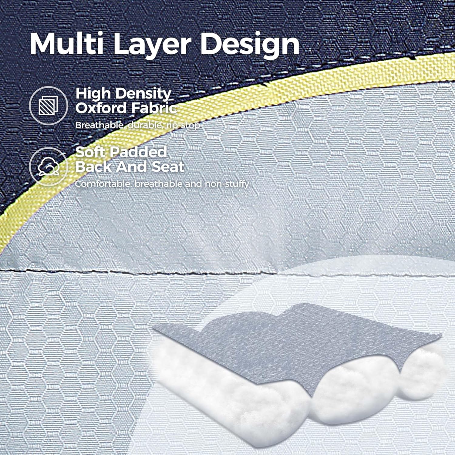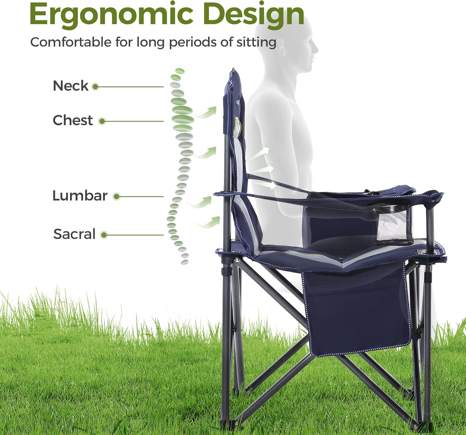 【Large Size】 Oversized Camping Folding Chair Size is 25.20″ L x 36.61″ W x 39.37″H, Weight is 13.2lbs, Large seat area with 600x 300D padded oxford fabric and padded armrest ensure comfort of this chair
