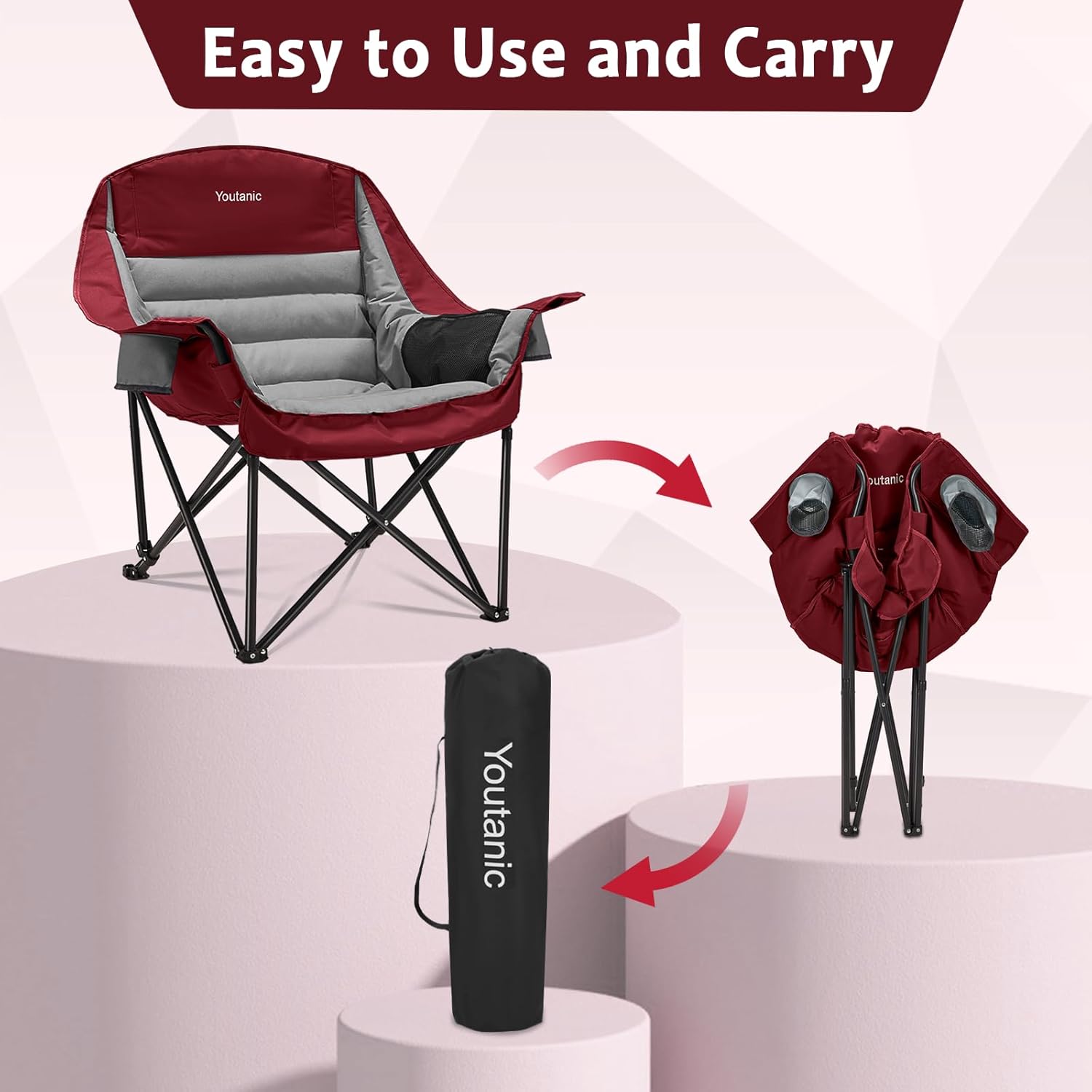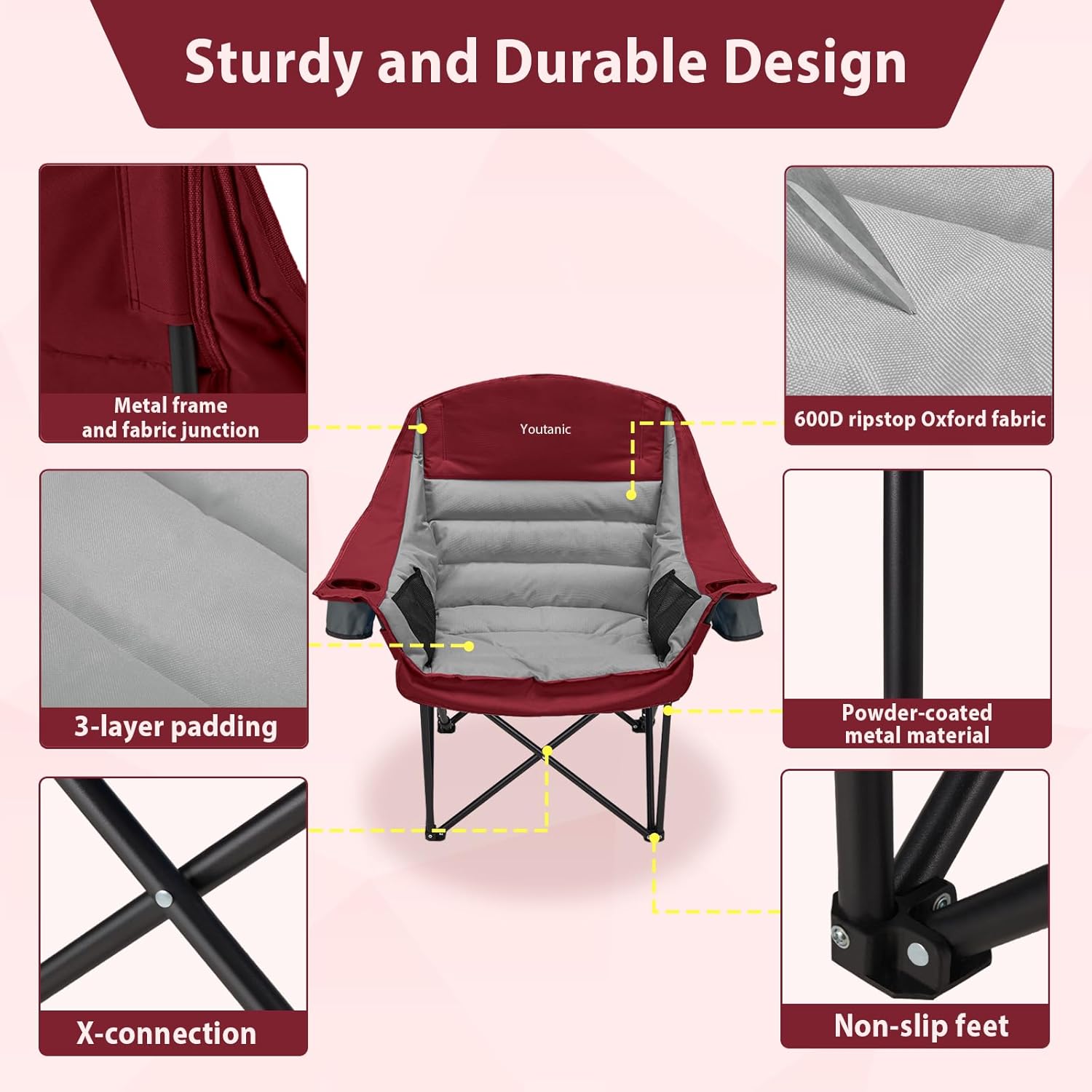 Extremely Comfortable: Our camping chairs for adults heavy duty, designed with ergonomic principles, feature spacious seats with unfolded dimensions of 40.5” L x 28” W x 39” H. The Camping Folding Chair is filled with high-loft, high-density padding in areas such as the headrest, backrest, armrests, and seat cushion, providing ample space and support for your head, neck, back, waist, and hips. This ensures a comfortable experience even during prolonged sitting