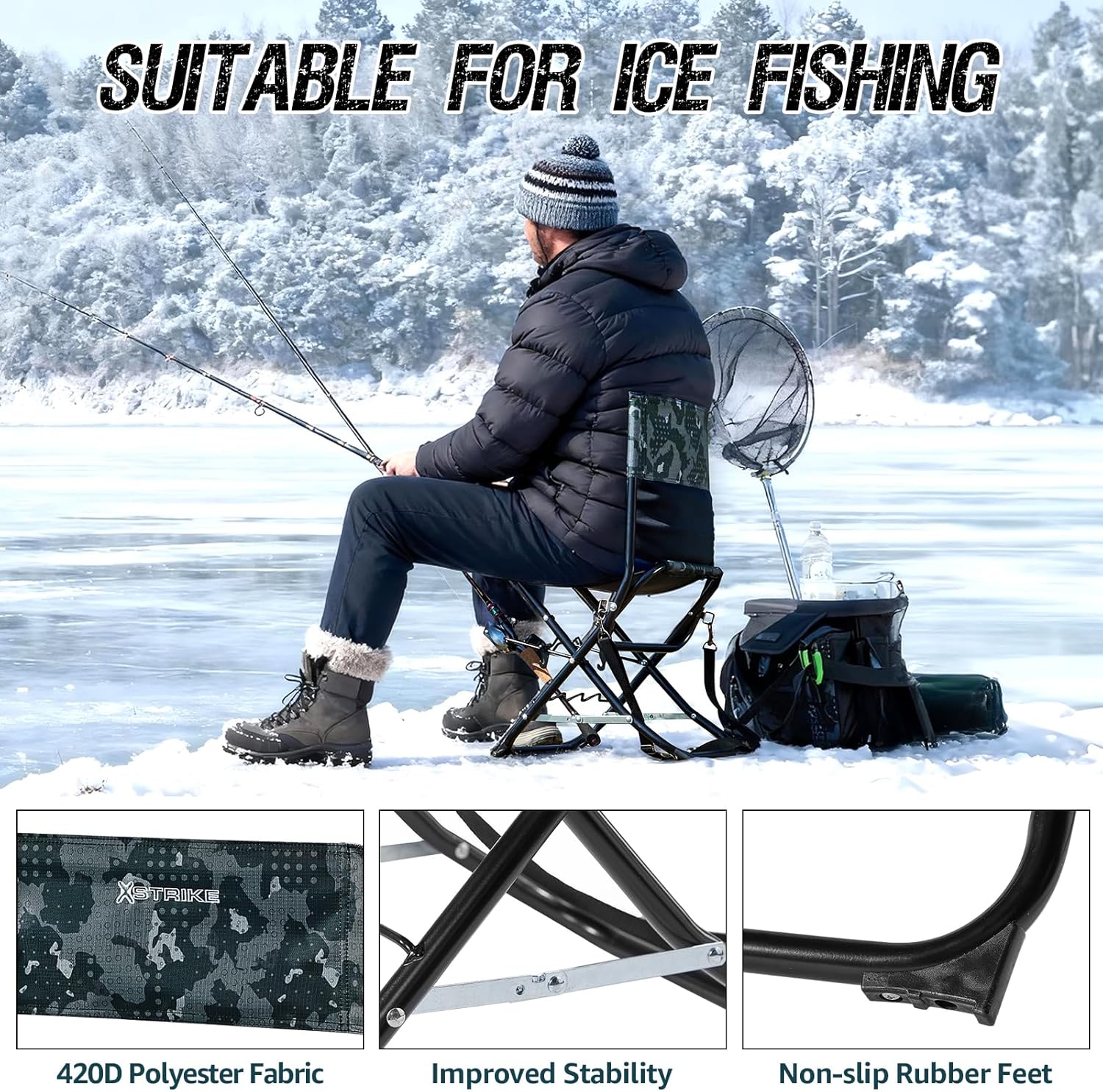 X Strike Fishing Chairs with Rod Holder Outdoor Folding Fishing Stool for Adults Portable Camping Chair for Ice Fishing, Camp, Lawn, Patio, Garden, 300LBS
