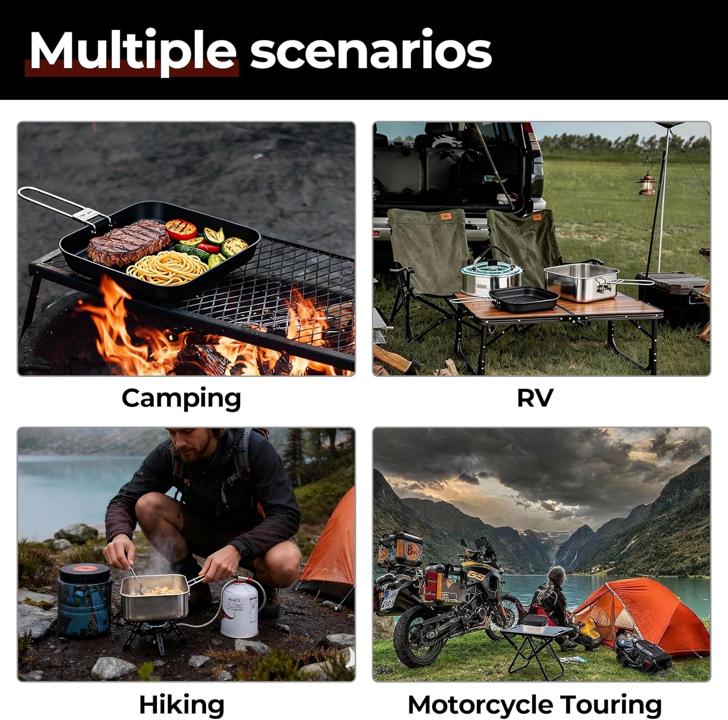 Full-Body Non-Stick Coating Pan – Crafted from lightweight aluminum alloy for rapid heating. Unlike camping pan, it features a full-body non-stick coating—applied not only to the cooking surface but also to the exterior—significantly enhancing durability and ease of cleaning. It also doubles as a lid for the square pot, enabling steam cooking, making it an indispensable 2-in-1 tool for your camping kitchen.