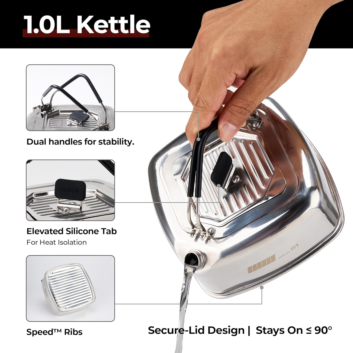 Stainless Steel Kettle with Burn-Proof Handles – This camping kettle prioritizes safety with two burn-proof handles. The larger thickened silicone handle keeps your hand away from heat, while the large main handle features a unique limit-stop design with a indent to securely lock your grip and prevent accidental contact. Further enhancing usability, the short spout of portable kettle is angled for drip-free pouring.