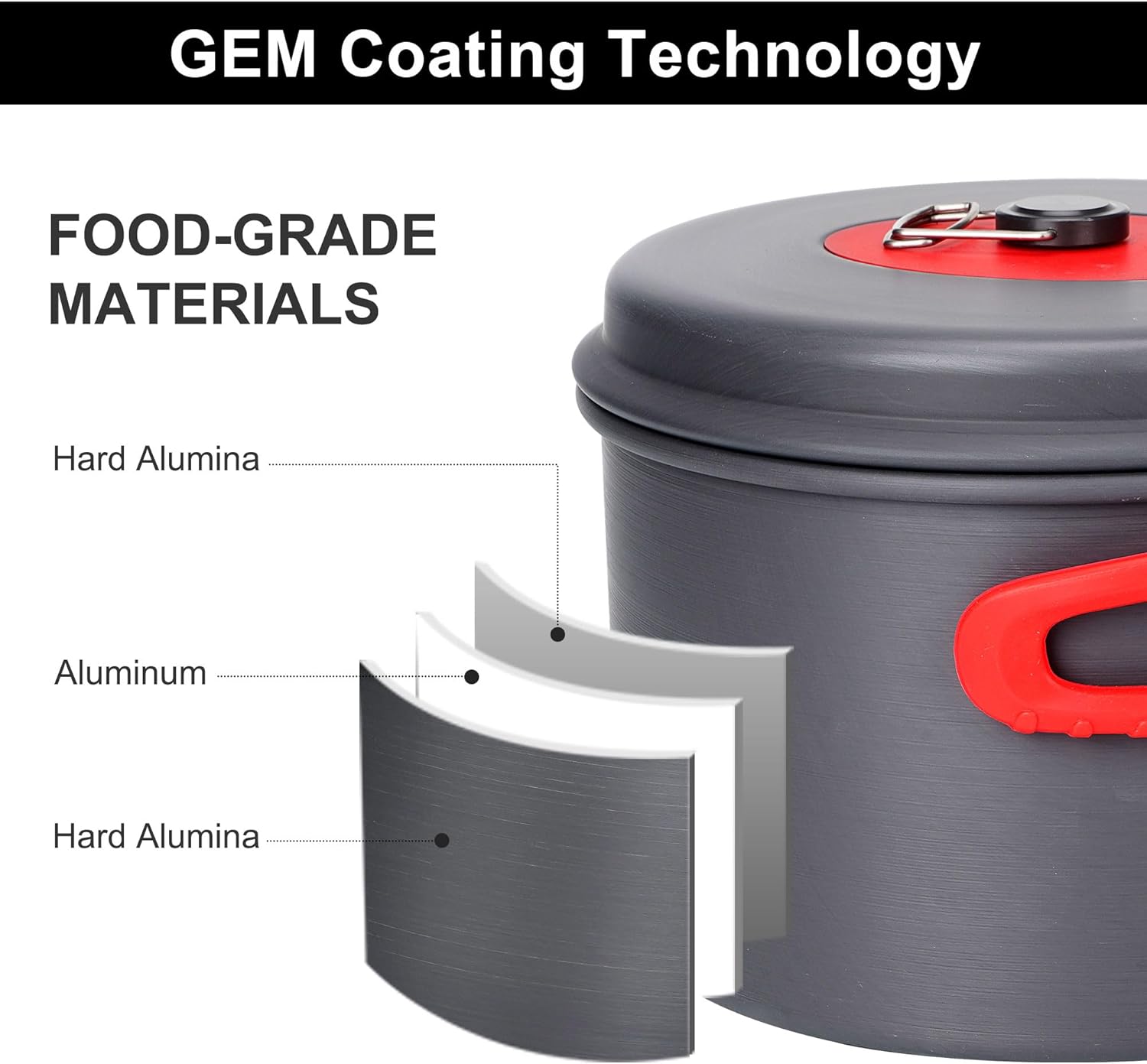 Durable & Safe: This camping cookware crafted from lightweight hard anodized aluminum and food-grade silicone compliant with US safety standards, this cookware resists high temperatures, scratches, and oxidation.