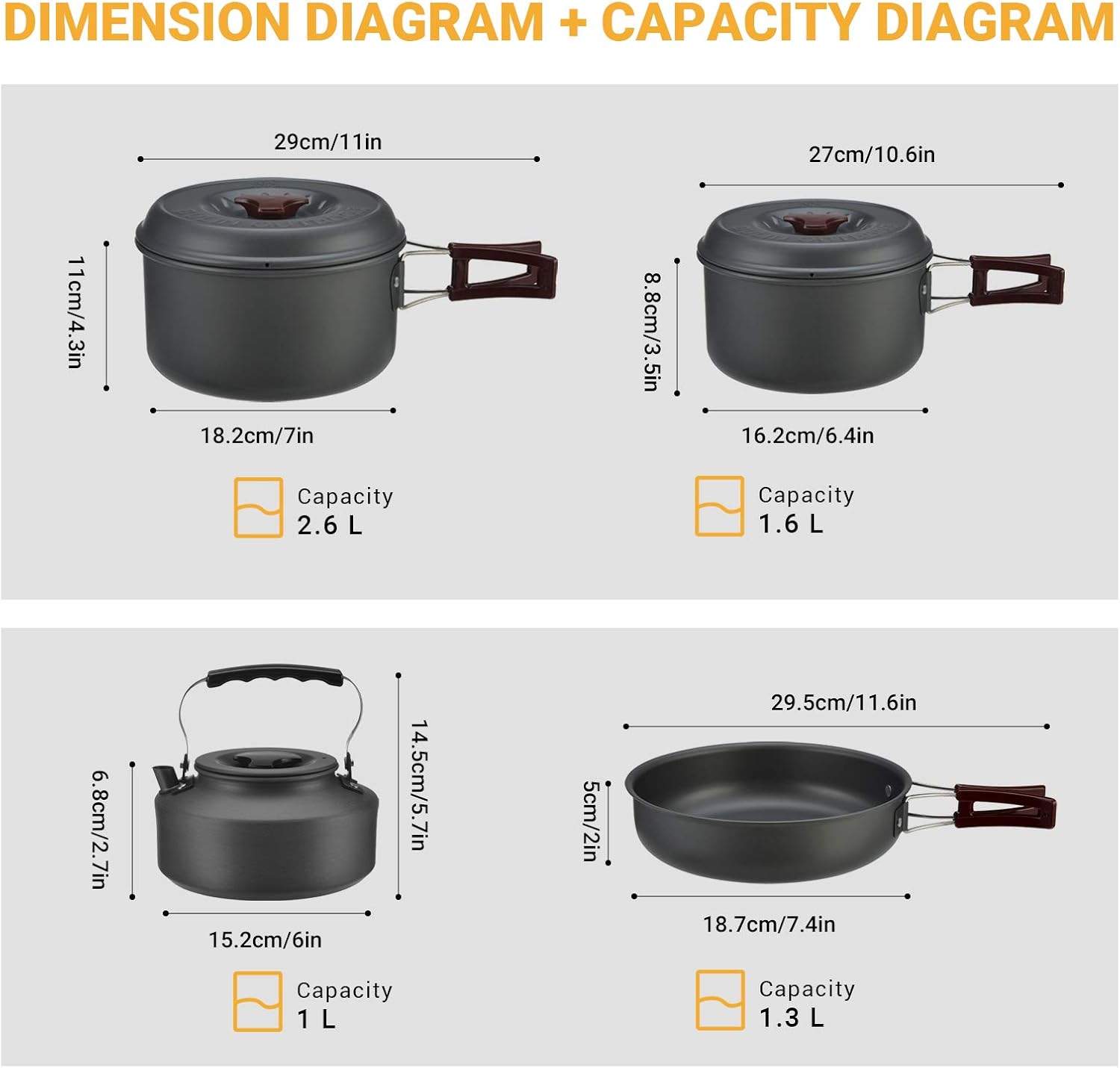【Complete Family Cookware Sets】The backpacking cooking set includes 2 pots with lids, 1 frying pan, 1 Kettle, 4 BPA -free bowls, 2 BPA free plates, 1 BPA free foldable soup Spoon, 1 rice ladle, and 1 cleaning sponge. Ideal for 2-4 person.
