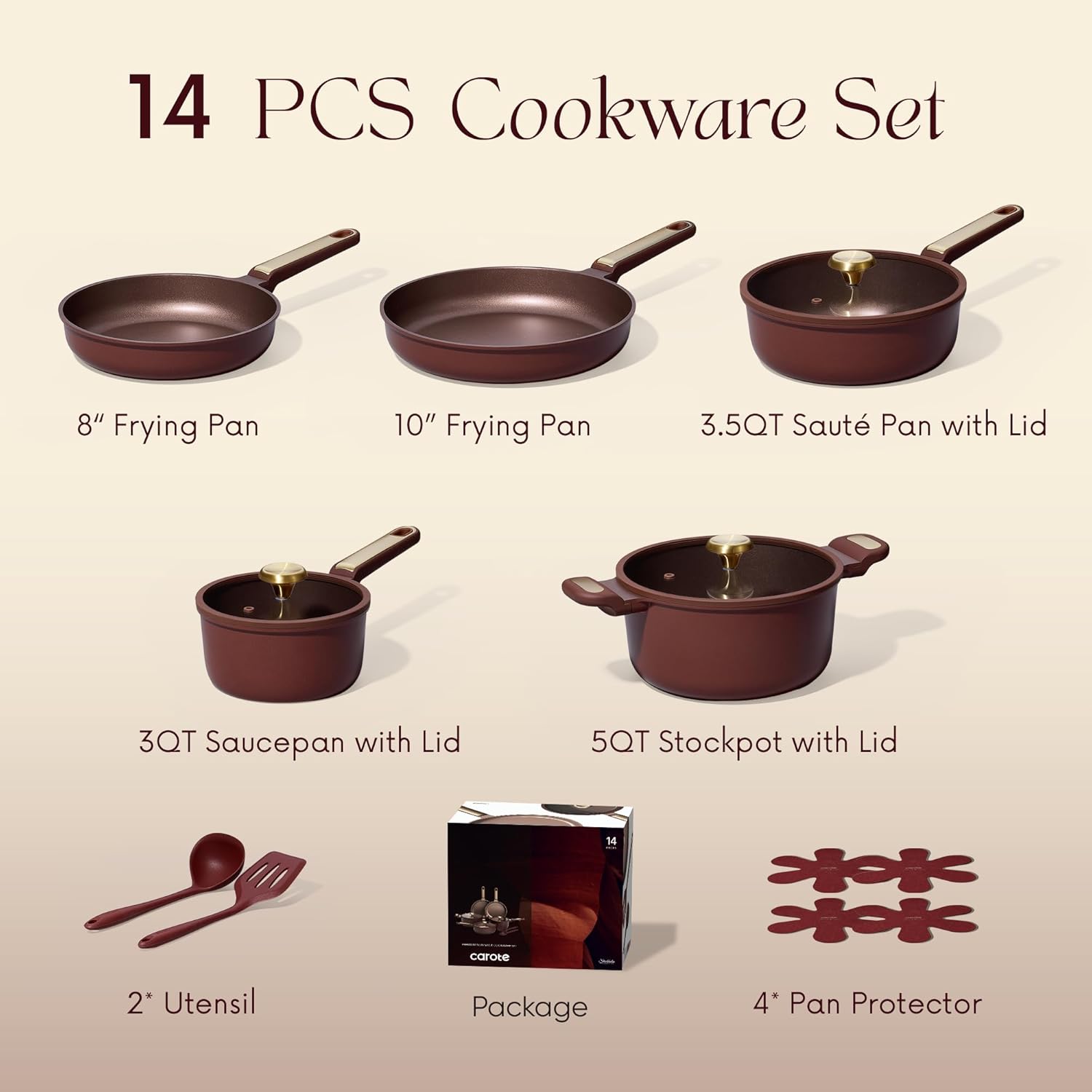 SET INCLUDES:1x 8″ Fry Pan, 1x 10″ Fry Pan, 1x 3Qt Saucepan with Lid, 1x 3.5Qt sauté pan with lid,and 1x 5Qt Stock Pot with Lid.ladle, spatula, 4*pan protectors.