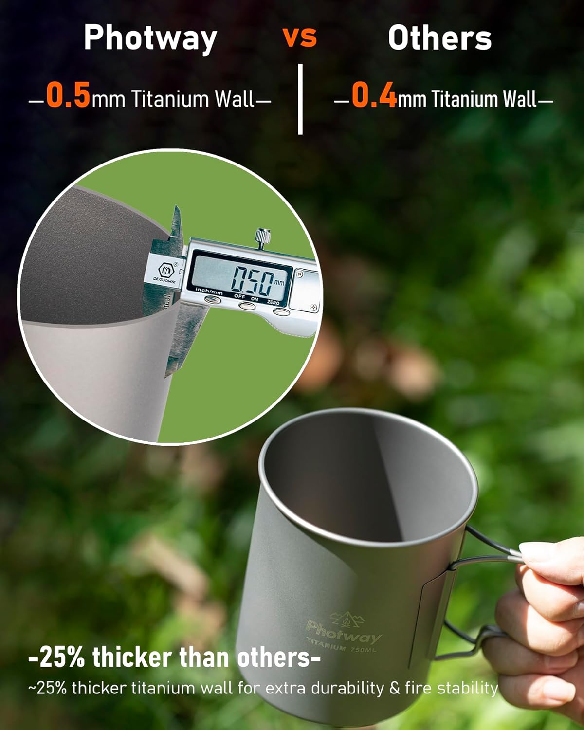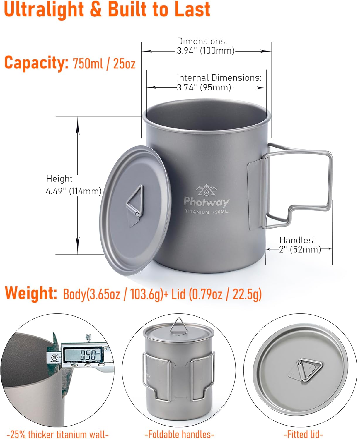 5mm Reinforced Wall & Ultralight Strength — upgraded 5mm titanium wall for greater durability and heat stability than typical 4mm pots. Weighs only 3.65oz (4.44oz with lid), delivering maximum strength without compromising pack weight.