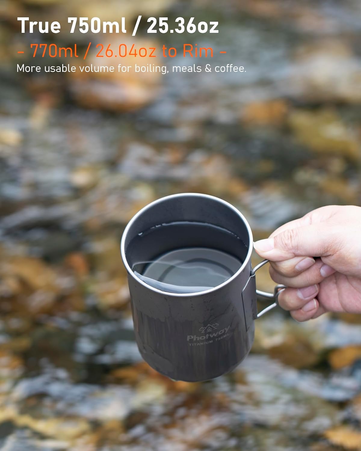 True 750ml(25oz) Capacity — 750ml(25oz) usable volume (770ml / 26oz to rim) for boiling water, cooking simple meals, brewing coffee, or melting snow during solo adventures and minimalist travel.
