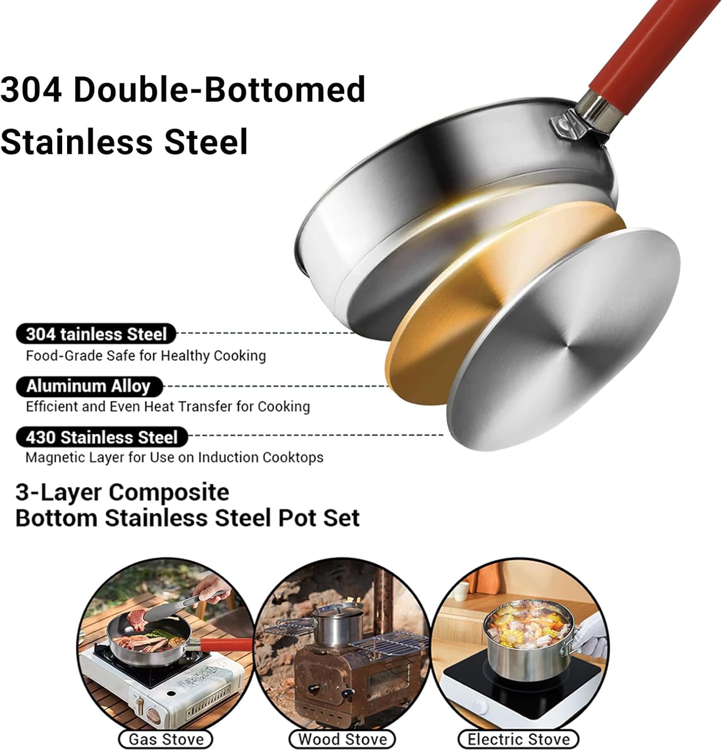 304 STAINLESS STEEL: The cookware is made of 304 double-bottomed stainless steel. The material is robustness and resistance against wear and tear or corrosion, and conducts heat speedly. Enjoy your outdoor meals, heated via open flame, charcoal, wood, gas or induction cooker with our cookware set.