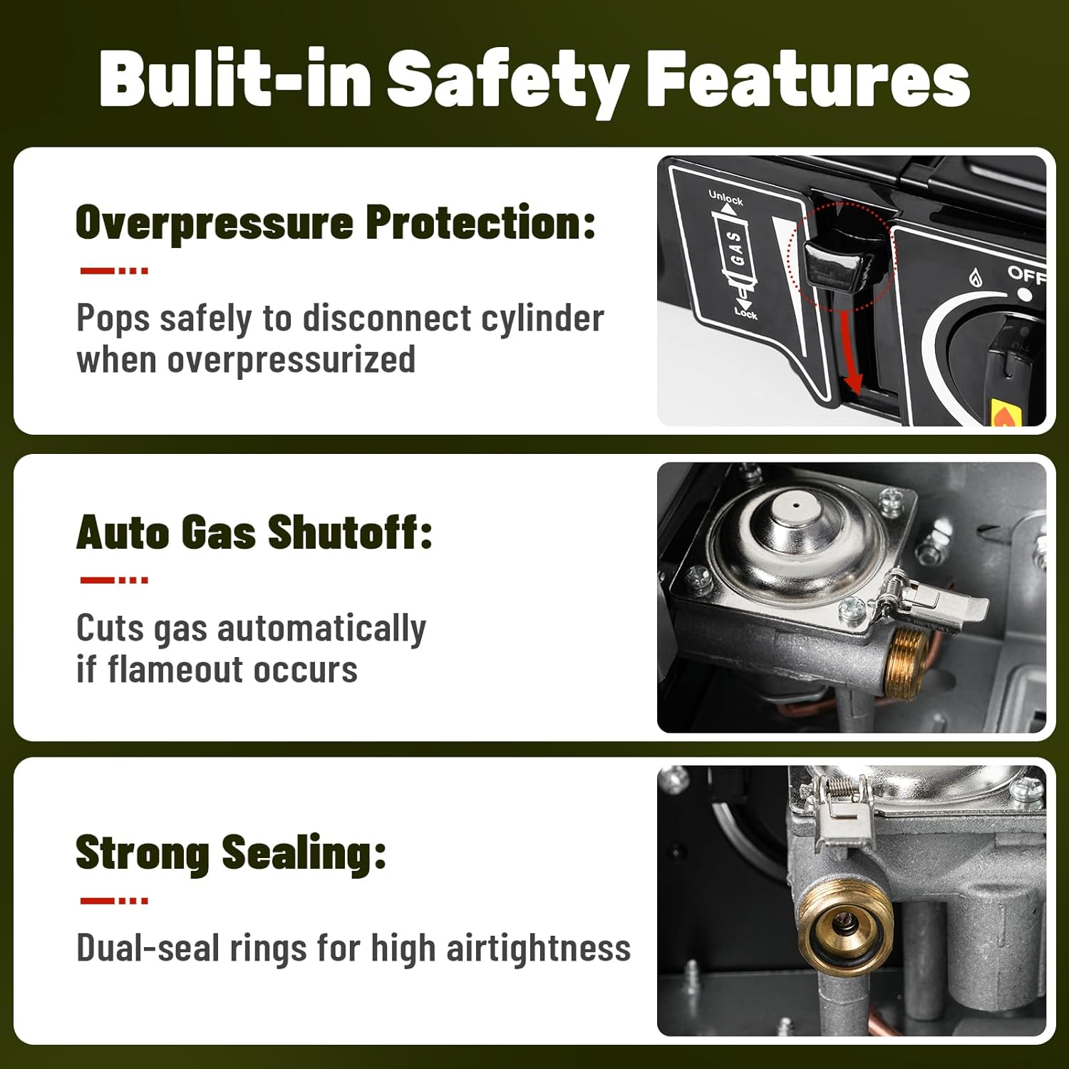 【Reliable Safety Features】 Overpressure protection ejects fuel canisters safely if pressure is irregular. Auto-shutoff cuts gas flow instantly if the flame goes out accidentally, keeping you safe