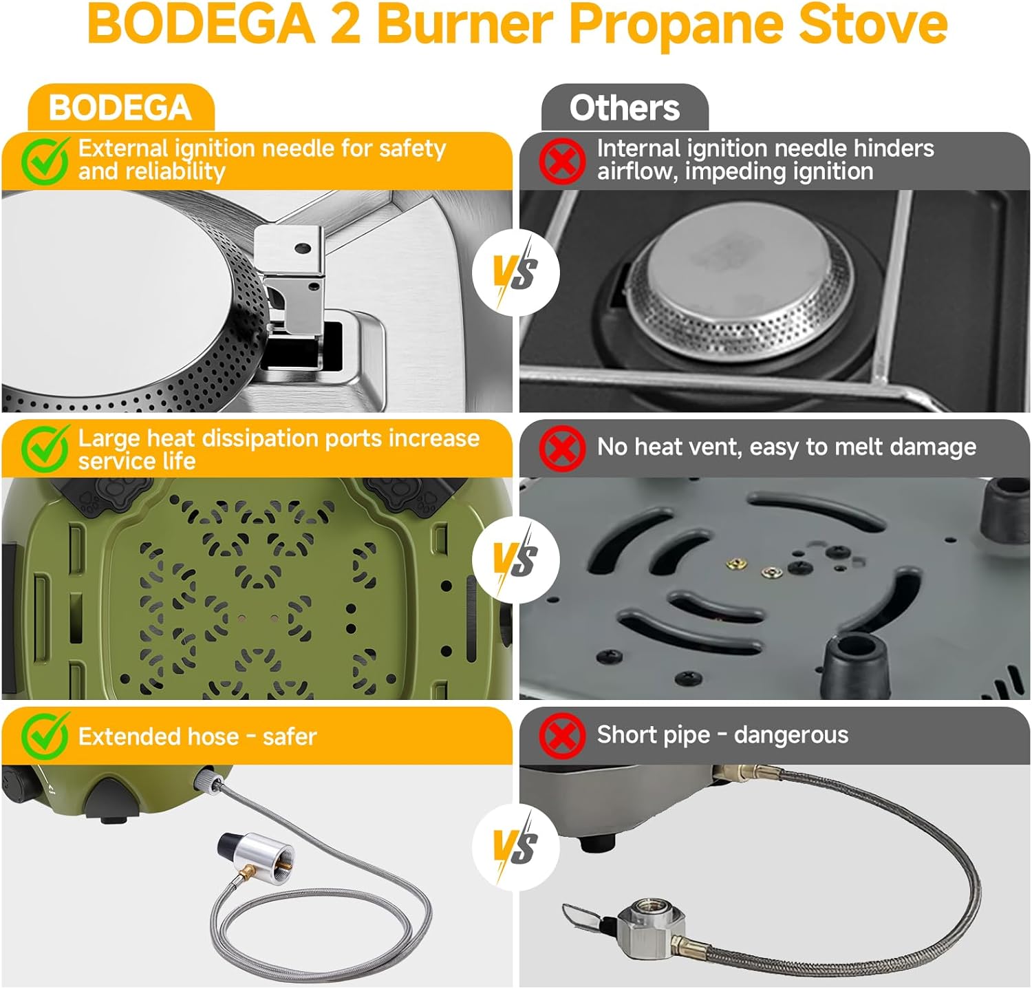 🎁Ideal Gift Choice – The BODEGA foldable camping propane stove stove includes a baking tray with a heat-resistant handle. Its textured side is perfect for grilling steaks and hot dogs, while the extended handle allows easy flipping and prevents burns. A perfect gift for outdoor campers, hikers, RV travelers, and BBQ lovers, it combines durable structure, compact size, versatile functions, and sleek design to meet all outdoor cooking needs. Enjoy our 24/7 customer service for anytime support.