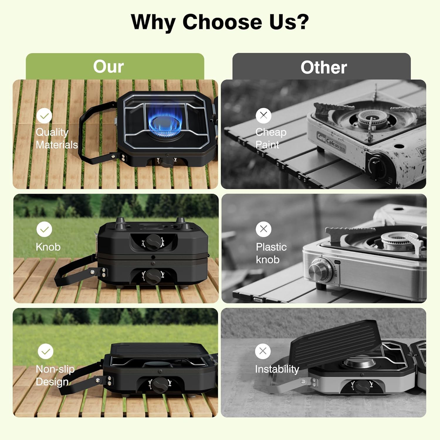Multi-Function Griddle for Versatile Cooking: Unlike standard camp stoves, this portable camping stoves model includes a removable griddle plate that lets you cook breakfast favorites like pancakes, bacon, and eggs while the second burner heats soup, coffee, or noodles. The gas stove dual setup means you can grill, fry, boil, and simmer at the same time, saving you time and effort during family outdoor gatherings. Camping stoves transforms from a simple camp stove into a versatile outdoor kitchen