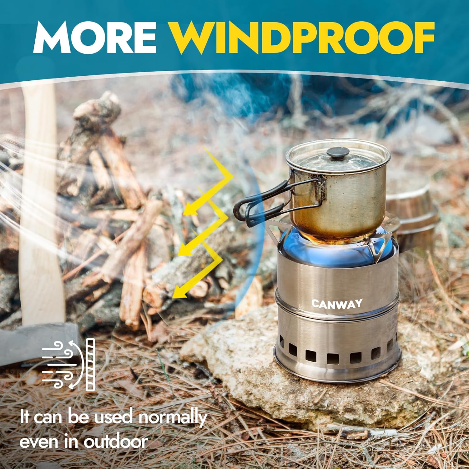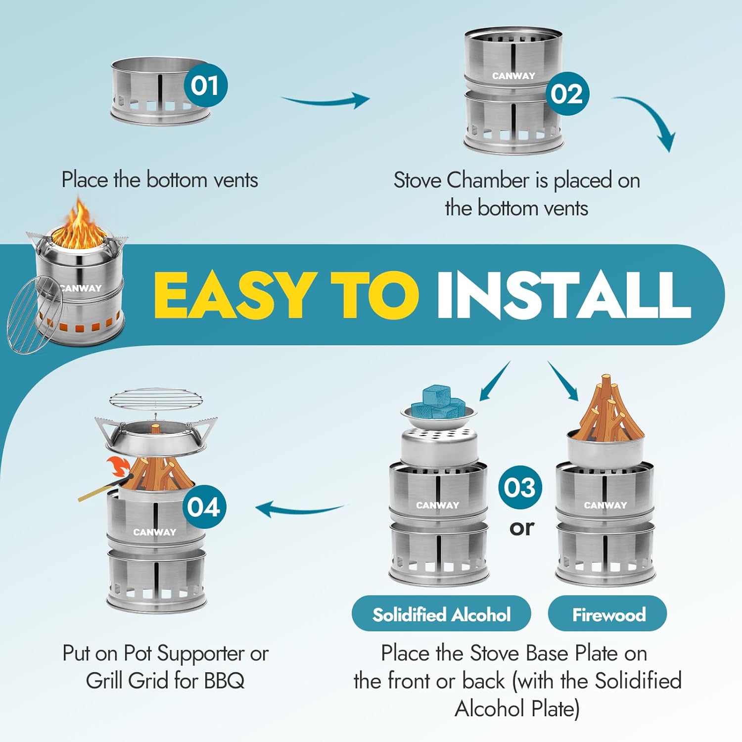 Sturdy Camping Stove: Made of high-quality stainless steel.This backpacking stove with 3 arms pot support base provides safe and stable cooking platform and distributes heat evenly. The style 1 is suitable for 1-2 people use, and this one has one more grill top for BBQ