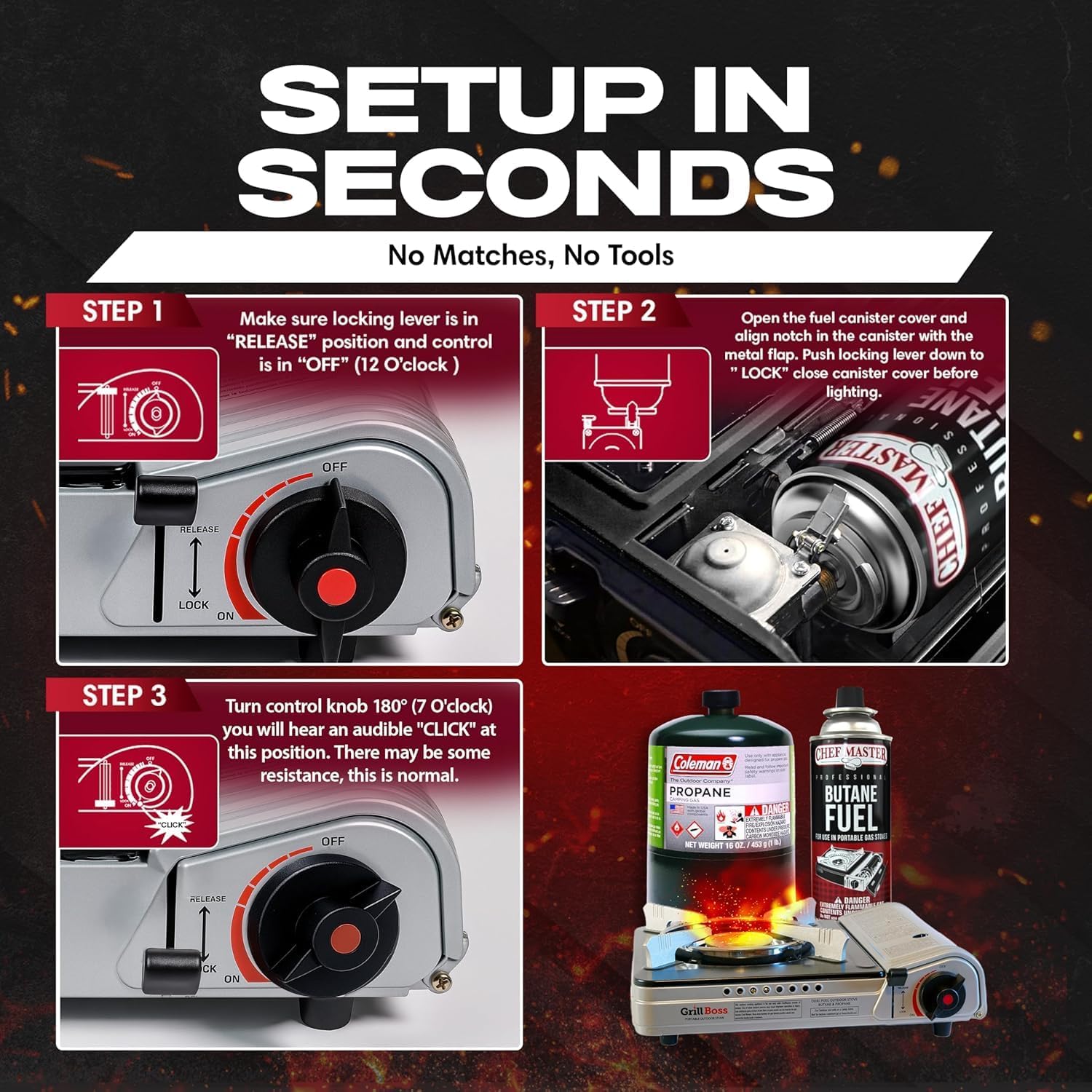 COMPACT & TRAVEL-READY CAMP STOVE FOR EVERY ADVENTURE – Take outdoor cooking to the next level with the Grill Boss Butane Camp Stove, your reliable partner for camping, hiking, backpacking, tailgating, and emergency situations. Lightweight and compact, this gas stove burner stores neatly in a durable hard-shell carrying case for easy transport and protection. Whether you’re setting up at a remote campsite or cooking on the move, this dual-fuel stove is built to deliver consistent, dependable heat.