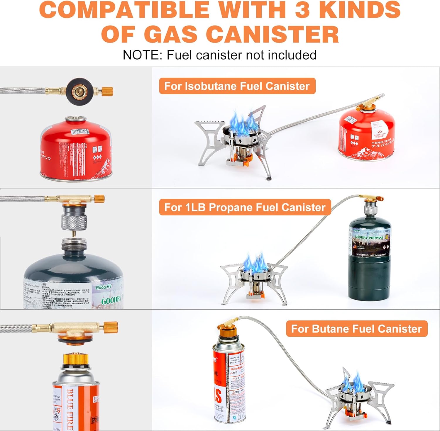 Compatible with 3 Kinds of Gas Canister: Our backpacking stove is compatible with isobutane, butane and 1lb propane fuel canister. You can choose the appropriate adapter according to the needs. In addition, the hose of the camping stove is lengthened to 50cm, which is longer than other stove with only 30cm hose. The distance between the stove and the gas cylinder is farther and safer when using.