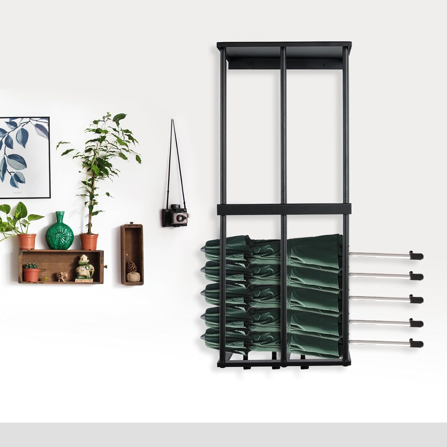 Efficient Space Utilization: Say goodbye to cluttered garages and messy storage rooms. This metal camping beach chair umbrella wall mounted holder rack organizer is specifically designed to make the most of unused wall space. It provides a convenient and organized solution for storing camping chairs, tents, umbrellas, yoga mats, and more. The shelf at the top creates extra storage space for small items, while the 4 hooks at the bottom are perfect for hanging hiking bags, hammock bags, and ropes. Maximize your space and keep everything neat and tidy.