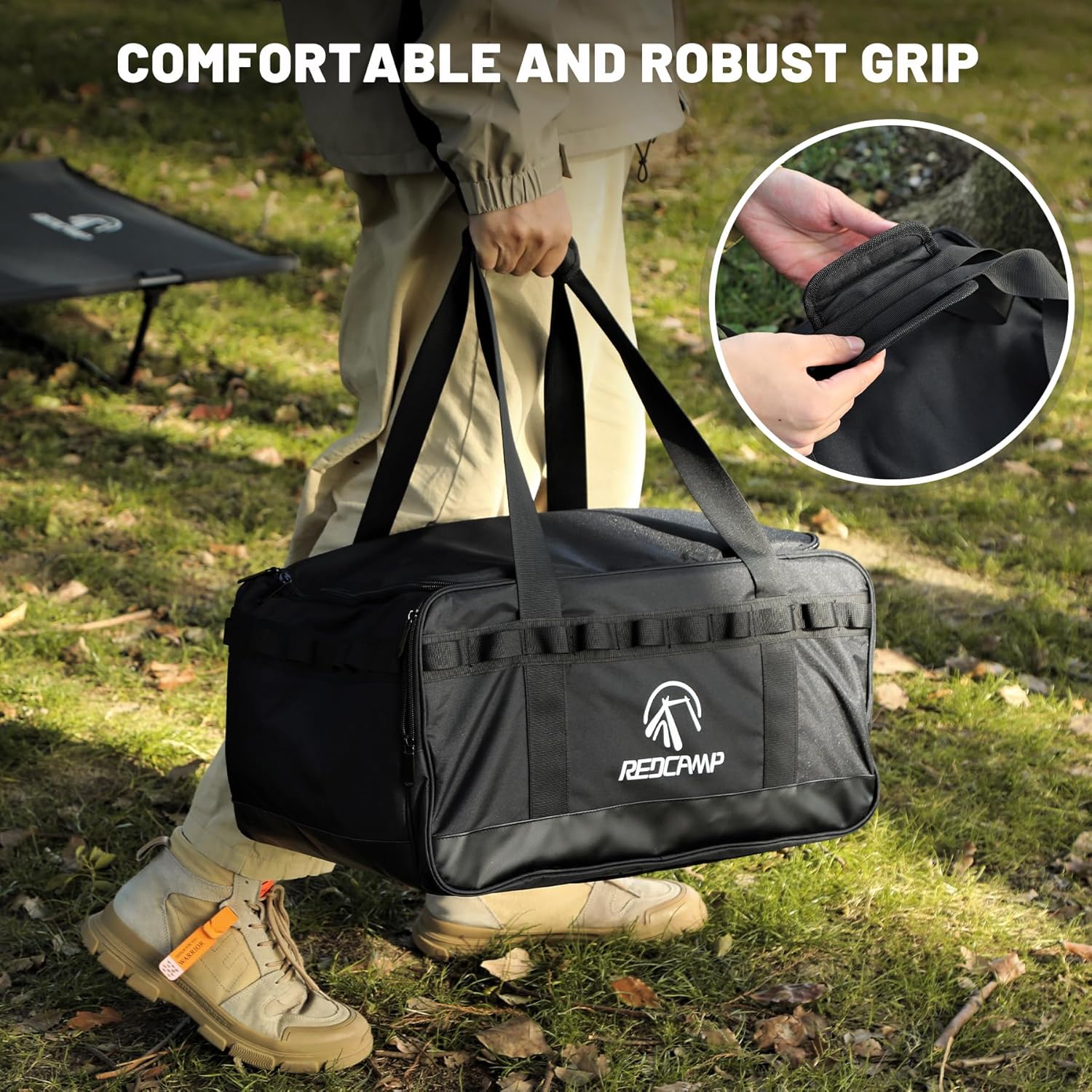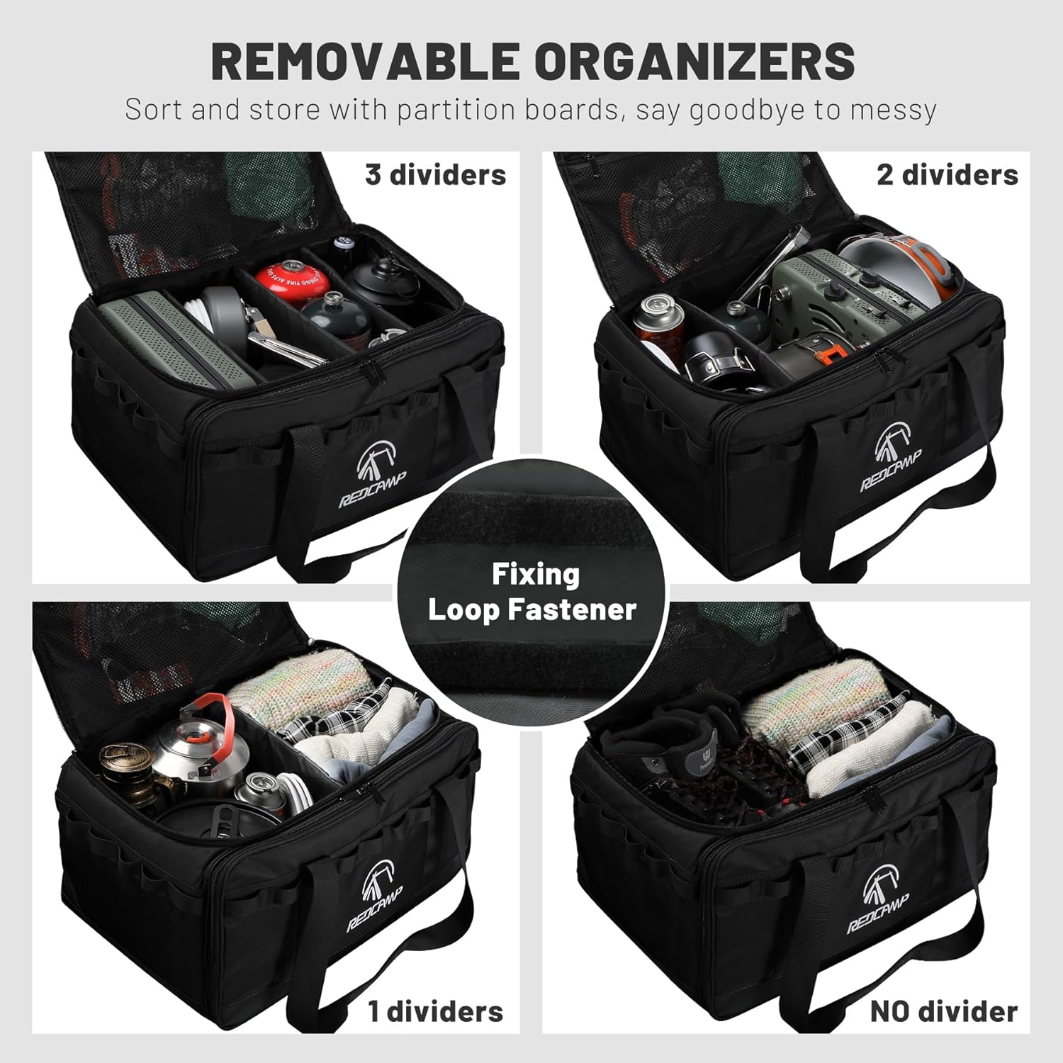 Premium Material: Crafted from high-quality 300D Oxford cloth and mesh fabric, this camping tote bag is designed for durability and scratch-resistance. The bag and internal divider plates are enhanced with pearl cotton, adding cushioning that protects your belongings from bumps and damage. The bottom with PU waterproof coating effectively prevents the items from moisture.