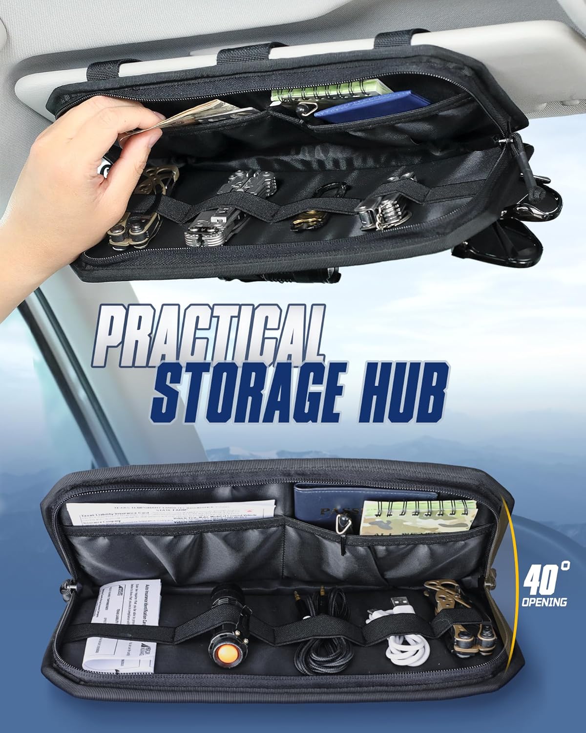 Car Enthusiast’s Dream : Versatile car visor organizer ideal for outdoor buffs, commuters, and professionals alike. Stores tactical gear, emergency supplies, and car insurance info. Whether you’re on a cross-country road trip, camping adventure, or running daily errands, stay prepared for every journey.