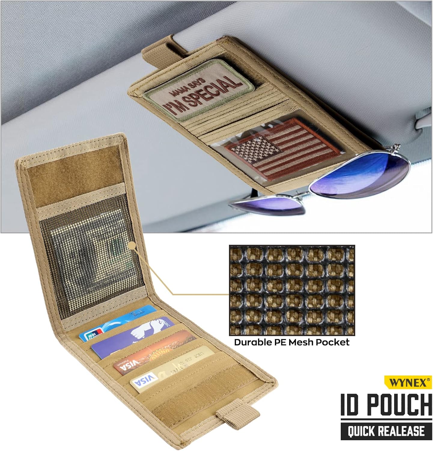Detachable All-in-One Card Pouch : Enjoy ultimate flexibility with the detachable card wallet. Independently in your bag or clip it to visor MOLLE panel. It securely stores cash, credit cards, IDs, and photos, functioning as a standalone card pouch for your automotive and personal needs.