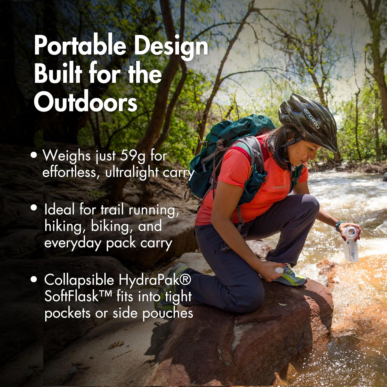 With the BeFree filter, you no longer have to worry about where your next drink will come from. Just fill up the 0. 6L Hydrapak flask and let the EZ-Clean membrane do the work. Gently squeeze the flask for instant treated water wherever you go. Maintain the EZ-Clean membrane quickly and easily for longer life and more enjoyment by simply fill the flask with water, attach the cover and shake free the debris. Or, remove the filter from the flask and swish in any lake, river or stream. And when you’re ready to “hit the road, ” the collapsible flask packs small to fit into tight spaces (running or pants pockets, cycling jerseys, fly vests, purses, etc.). just smash, stash and go! worry less and discover more with the BeFree water filter. Weight: 58g.