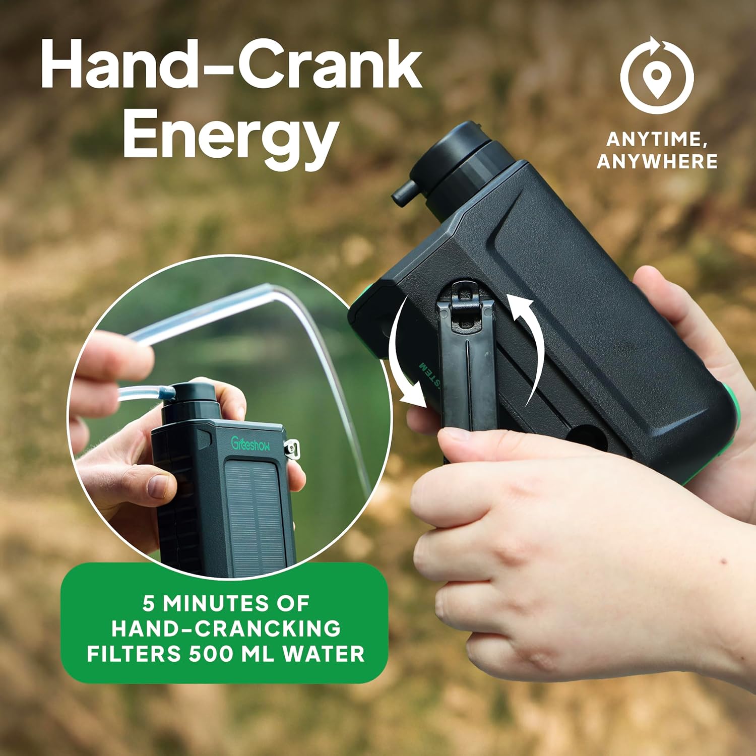 Three Charging Methods & 3000mAh Emergency Power Bank – The Greeshow Portable Water Filter offers three charging options: solar charging, USB charging, and hand-crank charging. This makes it both eco-friendly and energy-efficient. With just 5 minutes of hand cranking or 30 minutes of exposure to sunlight, you can filter 500ml of water, effectively addressing drinking water challenges in areas without power. Additionally, it includes a built-in 3000mAh emergency power bank and a 2-in-1 USB-C cable, allowing you to charge your phone and small devices during emergencies.