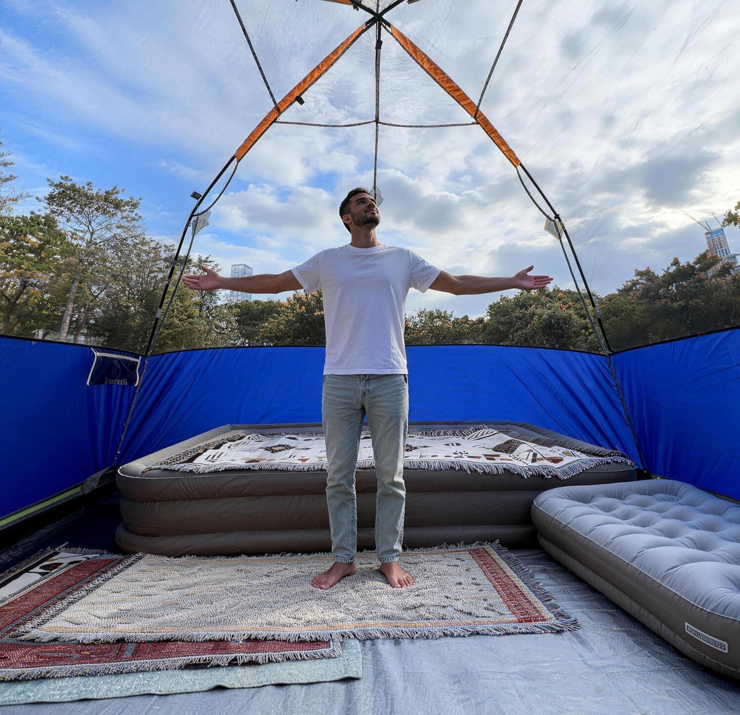 Unique 11ftΓ7ftΓ72in, well fitting 6 sleeping bags or 2 queen air mattress, ideal for family camping.