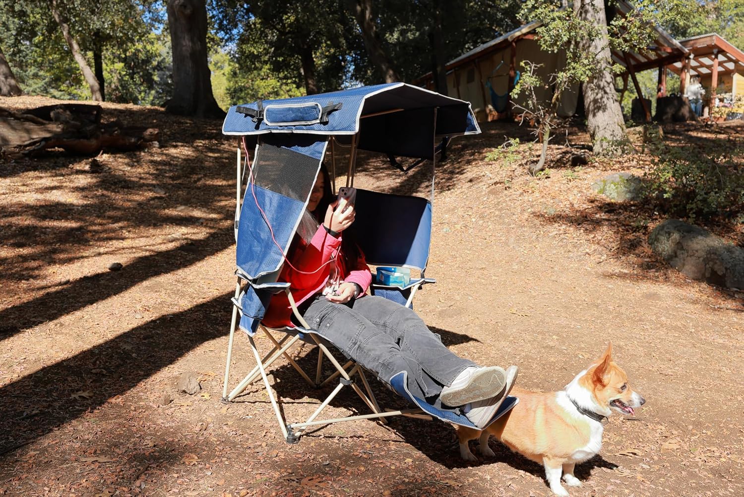 30W Solar Panel for Convenient Device Charging: This camping chair comes equipped with a 30W solar panel that enables you to charge your devices on the go using USB, Type-C, and DC ports. The USB, type-C&DC charging cable are included The removable canopy offers protection from both the sun and rain, and it can be easily installed and stored without the need for any tools.